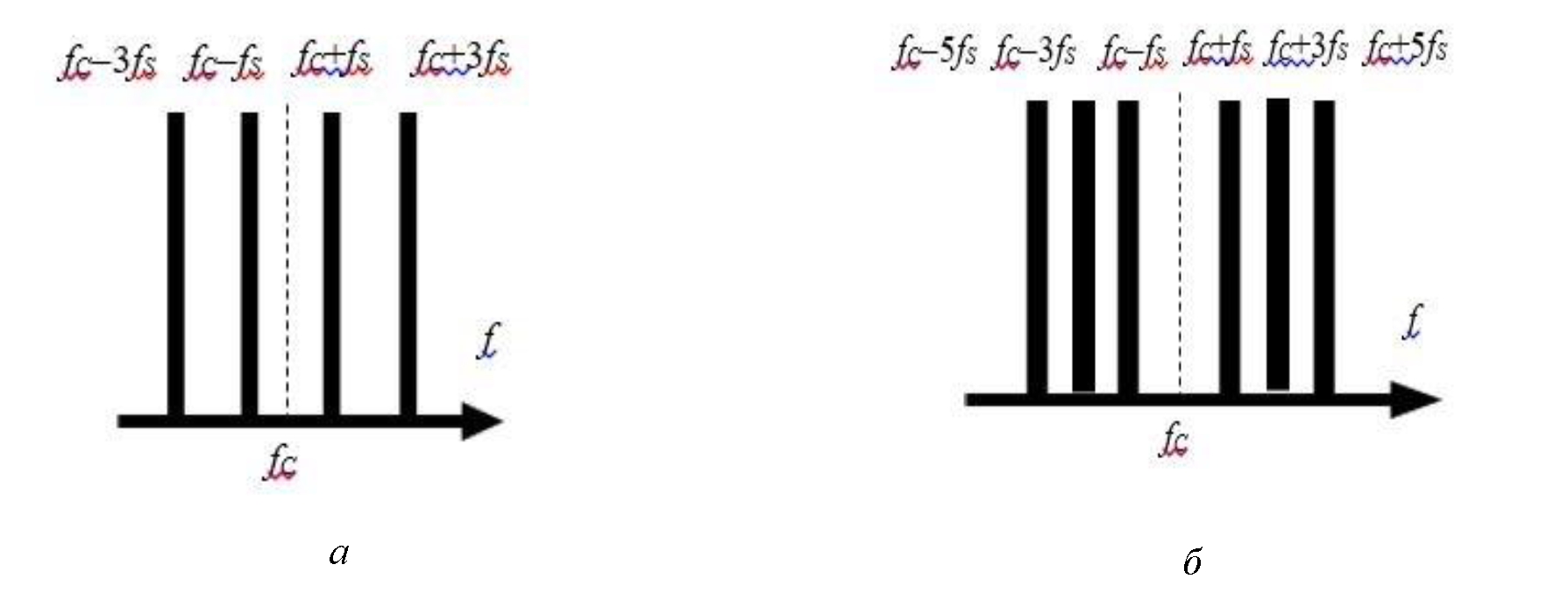Как известно, функция Бесселя является определяющей при формировании частотных характеристик однопортового АММЦ. Для построения ДМЗИ используется особенность функции Бесселя 1-го рода, имеющая равные значения для функций 1-го и 3-го порядков (точка D, рис. 10) при аргументе X, равном 3,102. На выходе АММЦ формируется двухчастотное (рис. 11,а) или трехчастотное (рис. 11,б) в полосе ДМЗИ, состоящее из нижней и верхней боковых полос на частотах fC ± nfS. Несущая частота fC подавлена до уровня 30-50 дБ в силу конструктивных особенностей модулятора. Полученное ДМЗИ поступает далее на ШФД.