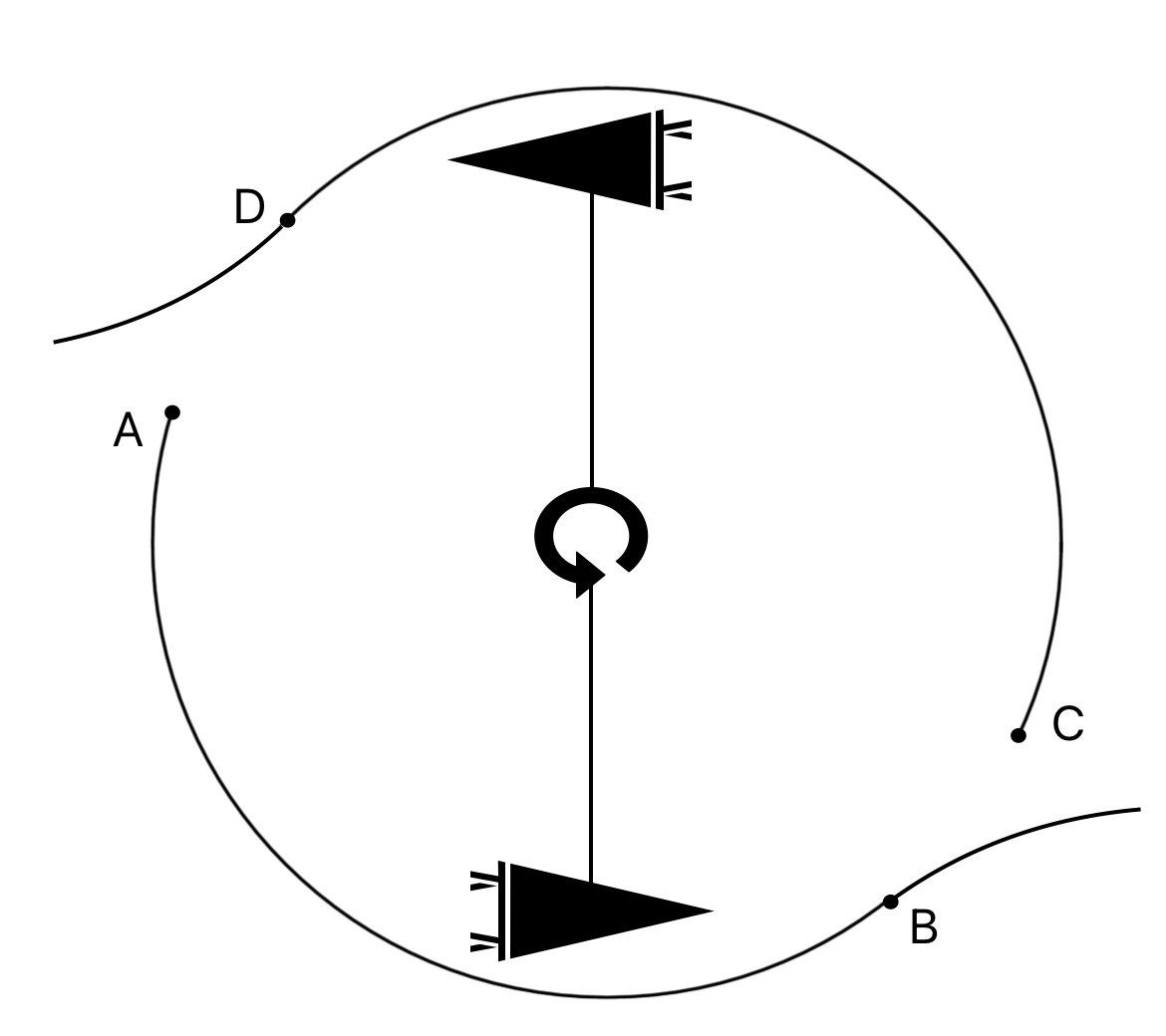 Единственным элементом, который нами не проверен и который сложно поддается расчетам, являются переходные характеристики при сбросе БПЛА. Учитывая наличие рельса в конструкции, на который будет падать БПЛА (это принципиальное конструктивное отличие от SpinLaunch) необходимо, чтобы переходные характеристики были достаточно узкими, чтобы БПЛА попадал на рельс в зону AB или CD (рис. 3), и обеспечивалась одновременность сброса, которая бы исключала чрезмерный удар по оси вращения в момент сброса.