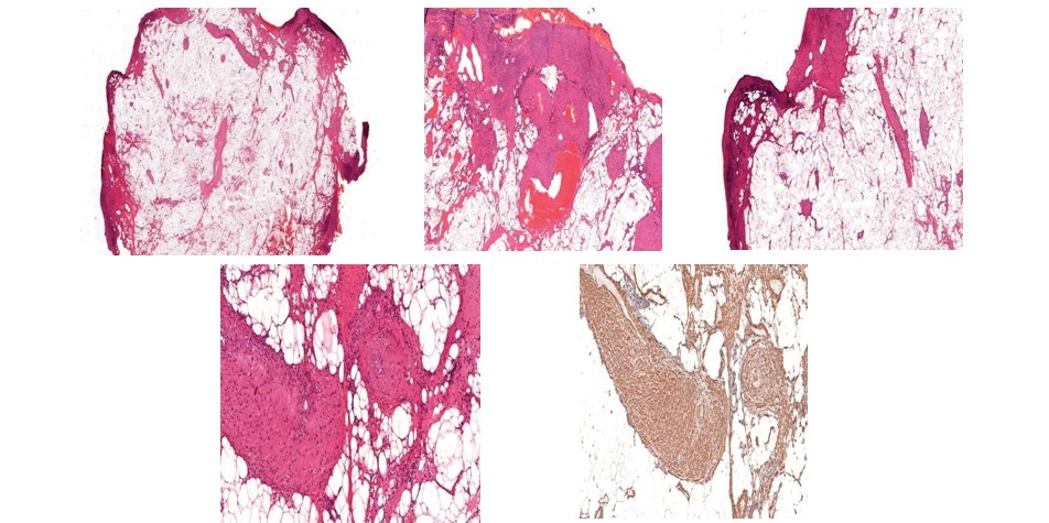 2b thick-walled vessels with a thickened wall due to the pericytic arrangement of bundles of smooth smooth muscles (Hematoxylin-Eosin stain, x40 magnification)
