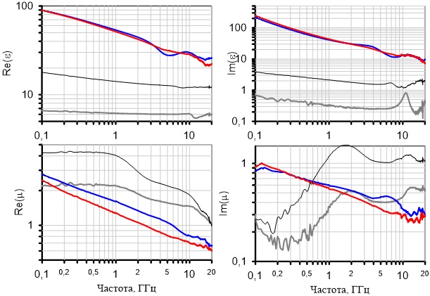 Рисунок 3 – Измеренные частотные зависимости диэлектрической ε и магнитной µ проницаемостей модельных композитов. Синие и красные линии – 40 % об. порошка стеклометалла ( г/см ), синие линии соответствуют образцу с порошком, полученным в одну стадию (без промежуточной гомогенизации), черные и серые линии - 40 и 20 % об. железа Р20, г/см и г/см соответственно