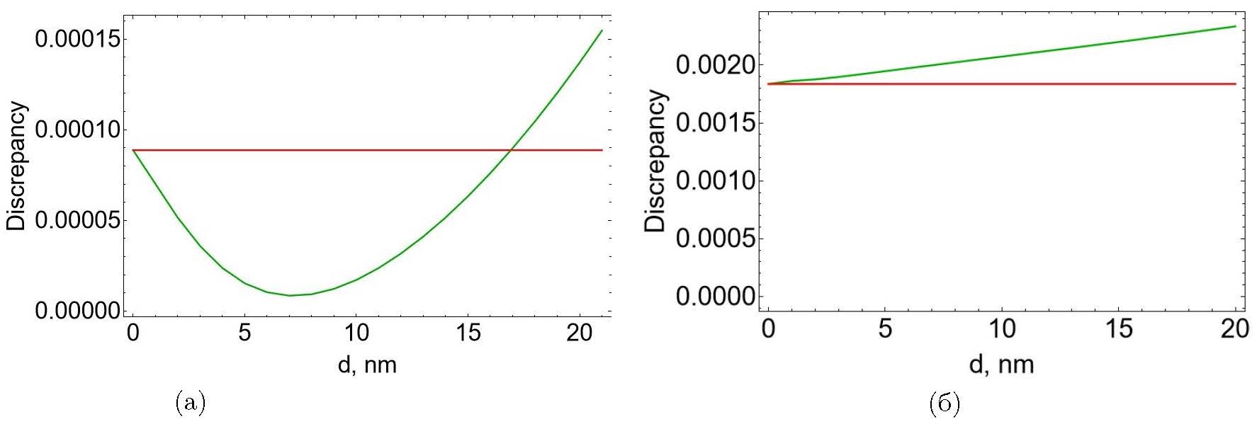 Рисунок 3 – Зависимость невязки, суммированной по различным значениям длины волны, от толщины палладиевого слоя (зелёные кривые) и не зависящее от толщины значение невязки, рассчитанной через параметр тонкого слоя (красные горизонтальные линии) а) для палладия без отжига, б) для палладия с отжигом