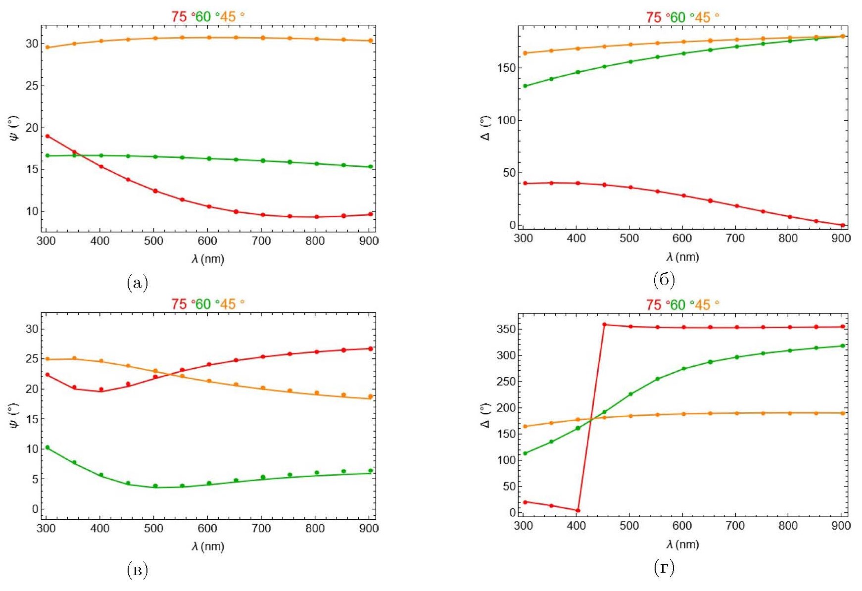 Экспериментальные данные для численной обработки были получены из эллипсометрических измерений параметров Ψ, ∆ (далее совместно приведены данные для слоя палладия с отжигом и без отжига). Эллипсометрия снималась при углах падения 45, 60 и 75 °.