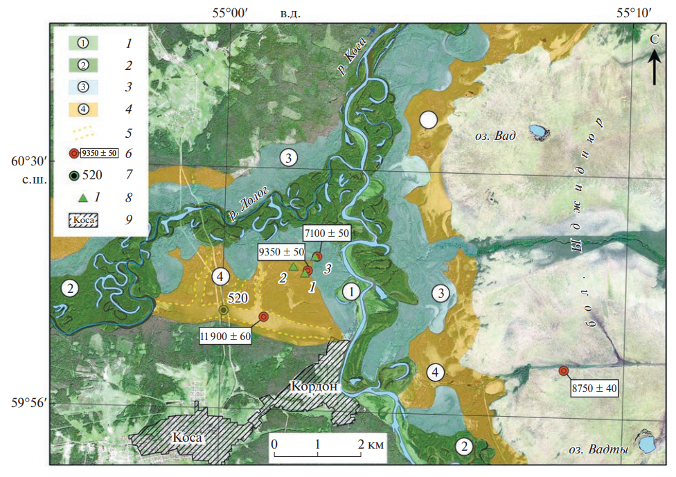 Рис. 2. Геоморфологическая карта района исследований. Пойма: 1 – низкая, 2 – высокая; надпойменная терраса: 3 – первая, 4 – вторая; 5 – контур заболоченной ложбины (палеорусла Лолога) и ее притоков на второй надпойменной террасе; 6 – расположение пробуренных скважин и радиоуглеродные даты; 7 – местоположение скважины Камской партии Всесоюзного гидрогеологического треста; 8 – археологические памятники (стоянки): 1 – Коса I, 2 – Коса II, 3 – Коса III; 9 – населенные пункты. Fig. 2 . Geomorphological map of the study area. 1 – low floodplain; 2 – high floodplain; 3 – 1st terrace; 4 – 2nd terrace; 5 – palaeochannels of Lolog and its tributaries on the 2nd terrace; 6 – location of boreholes and 14 C dates; 7 – location of deep-drilling boreholes; 8 – archaeological sites: 1 – Kosa I, 2 – Kosa II, 3 – Kosa III; 9 – settlements.
