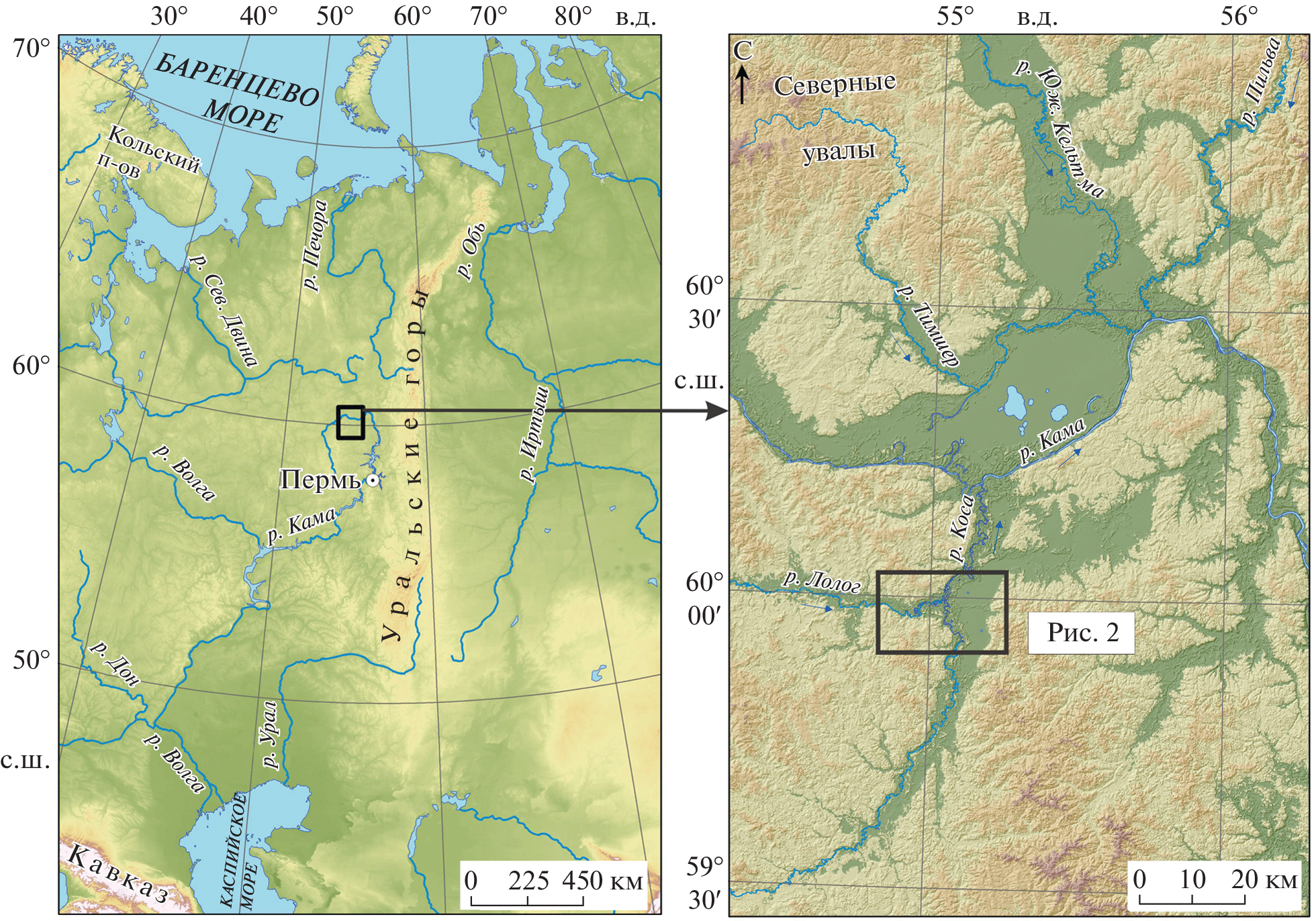 В качестве такого района может рассматриваться место слияния рек Лолог и Коса в северном Прикамье ( рис. 1 ), где первые люди появляются в раннем голоцене. Предыдущие исследования показали достаточно тесную связь между локальными природными обстановками и выбором стратегий расселения человеческих обществ в долине Верхней Камы в голоцене (Зарецкая и др., 2020; Лычагина и др., 2021).