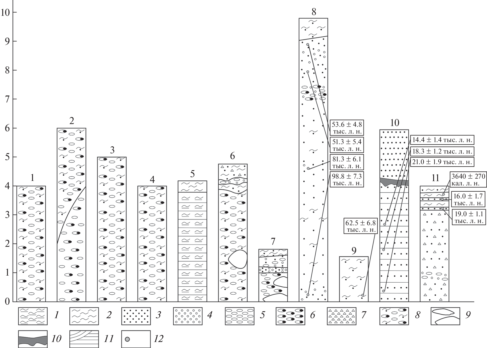 Рис. 2. Колонки опорных четвертичных разрезов. 1 – алевропелит; 2 – алеврит; 3 – песок; 4 – гравий; 5 – галька; 6 – валуны; 7 – дресва; 8 – диамиктон; 9 – глыбы; 10 – палеопочва; 11 – слоистость; 12 – люминесцентные и радиоуглеродные даты (Panin, Baryshnikov, 2015a,b; Agatova et al., 2020; Зольников и др., 2021). Fig. 2 . Columns of reference Quaternary sections. 1 – aleuropelite; 2 – aleurite; 3 – sand; 4 – gravel; 5 – pebbles; 6 – boulders; 7 – gruss; 8 – diamicton; 9 – blocks; 10 – paleosoil; 11 – bedding; 12 – luminescence and radiocarbon dates (Panin and Baryshnikov, 2015a,b; Agatova et al., 2020; Zolnikov et al., 2021).