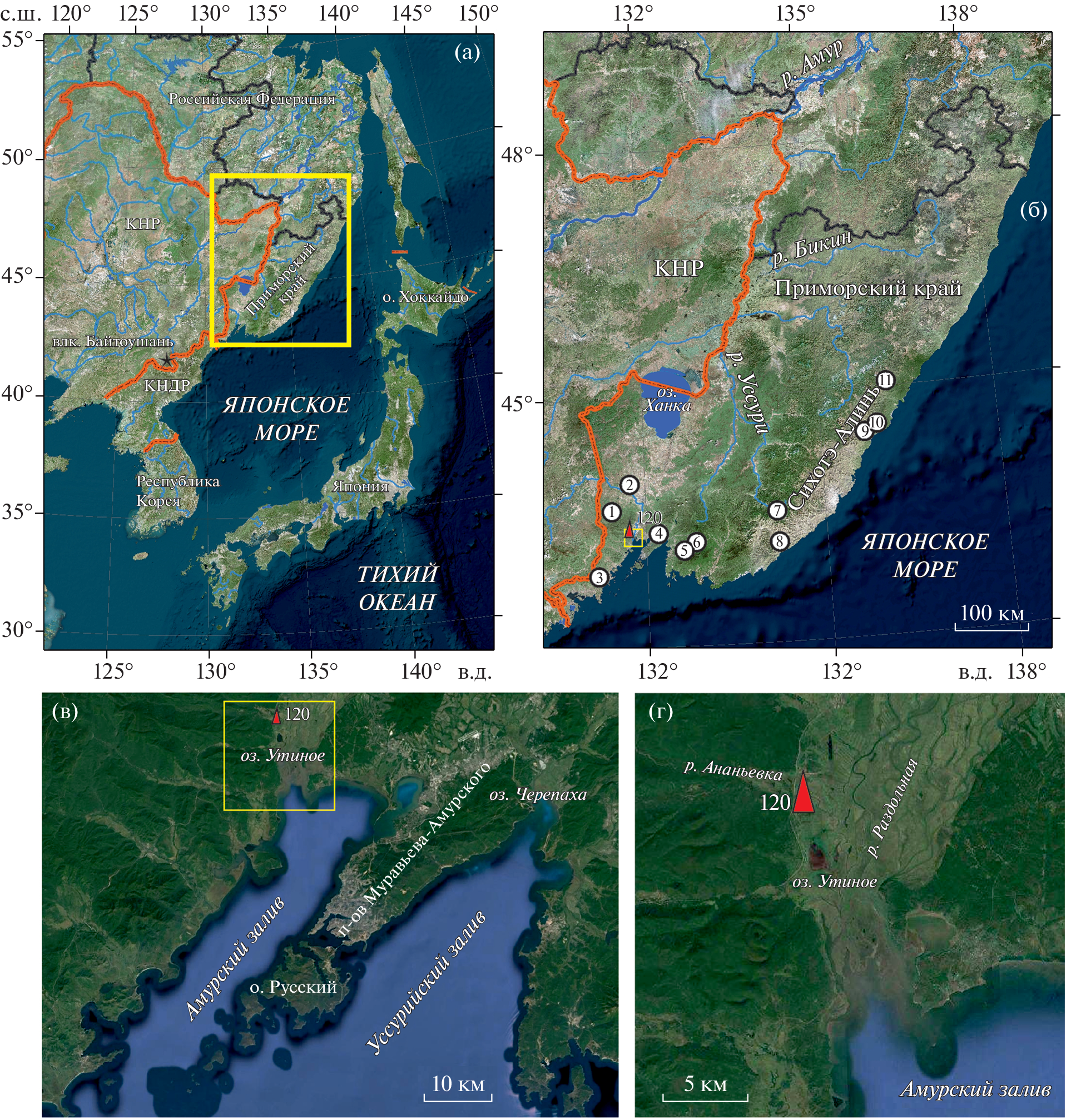 Рис. 1. Район работ. (а) – Япономорский регион; (б) – Приморский край и расположение разрезов, с которыми проводится сравнение: 1 – Шуфанское плато, 2 – Старореченское городище, 3 – бух. Бойсмана, 4 – оз. Черепаха, 5 – р. Стеклянуха, бассейн р. Шкотовка, 6 – Шкотовское плато, 7 – р. Милоградовка, 8 – бух. Кит, 9 – бух. Лангоу I, 10 – зал. Опричник, 11 – Солонцовские озера; (в, г) – положение опорного разреза 120. Fig. 1 . Study area. (a) – Japan Sea region; (б) – Primorye and position of study area and sections to be compared: 1 – Shufan Plateau, 2 – Starorechenskoe fortress, 3 – Boisman Bay, 4 – Cherepakha Lake, 5 – Steklyanukha River, Shkotovka River Basin, 6 – Shkotovskoe Plateau, 7 – Milogradovka River, 8 – Kit Bay, 9 – Langou I Bay, 10 – Oprichnik Bay, 11 – Solontsovskie lakes; (в, г) – position of the reference section 120.