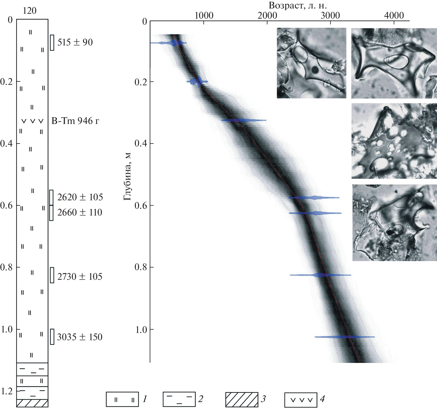 Рис. 2. Возрастная модель, скорости накопления озерно-болотных отложений на побережье Амурского залива и вулканическое стекло из прослоя тефры B-Tm. 1 – торф, 2 – алеврит, 3 – торфянистый алеврит, 4 – вулканический пепел. Fig. 2 . Age-depth model, accumulation rates of lacustrine-swamp sediments on Amur Bay coast and volcanic glass from B-Tm tephra layer. 1 – peat, 2 – silt, 3 – peaty silt, 4 – volcanic ash.