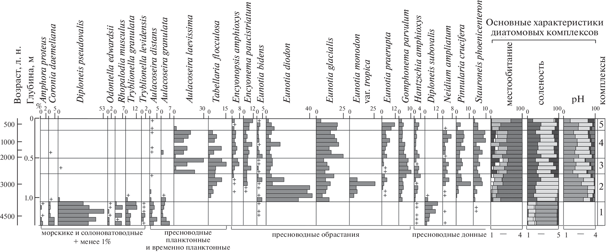 Эволюция озерно-болотных обстановок. Диатомовый анализ показал сложную динамику и неоднократную смену озерно-болотных обстановок на побережье. Выделено 5 диатомовых комплексов, отражающих эволюцию водоема ( рис. 3 ).