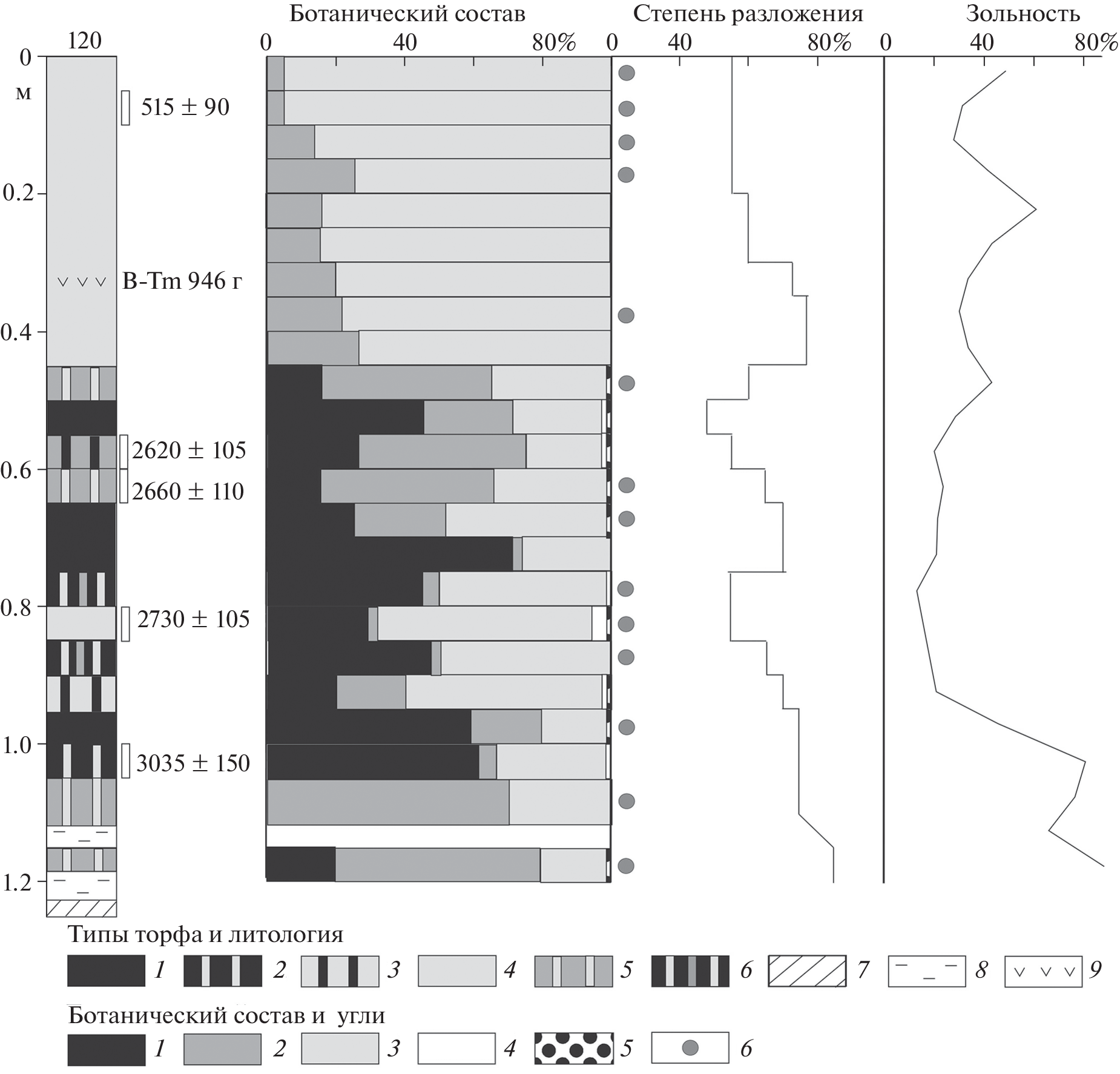 Рис. 4. Ботанический состав и характеристики торфа, разрез 120, побережье Амурского залива.Типы торфа: 1 – древесный, 2 – травяно-древесный, 3 – древесно-травяной, 4 – травяной, 5 – травяно-кустарниковый, 6 – комплексный, 7 – торфо-минеральный горизонт, 8 – алевритовый ил, 9 – вулканический пепел. Ботанический состав: 1 – древесные, 2 – кустарнички, 3 – травы, 4 – сфагновые мхи, 5 – зеленые мхи, 6 – древесный уголь. Fig. 4 . Botanical composition and peat characteristics, section 120, Amur Bay coast. Peat types:1 – woody, 2 – herbaceous-woody, 3 – woody-herbaceous, 4 – herbaceous, 5 – herbaceous-shrub, 6 – complex, 7 – peaty-mineral horizon, 8 – silt, 9 – volcanic ash. Botanical composition: 1 – wood, 2 – shrub, 3 – herb, 4 – sphagnum mosses, 5 – brown mosses, 6 – charcoal. Graphs on the right: the degree of decomposition and mineral content of peat.