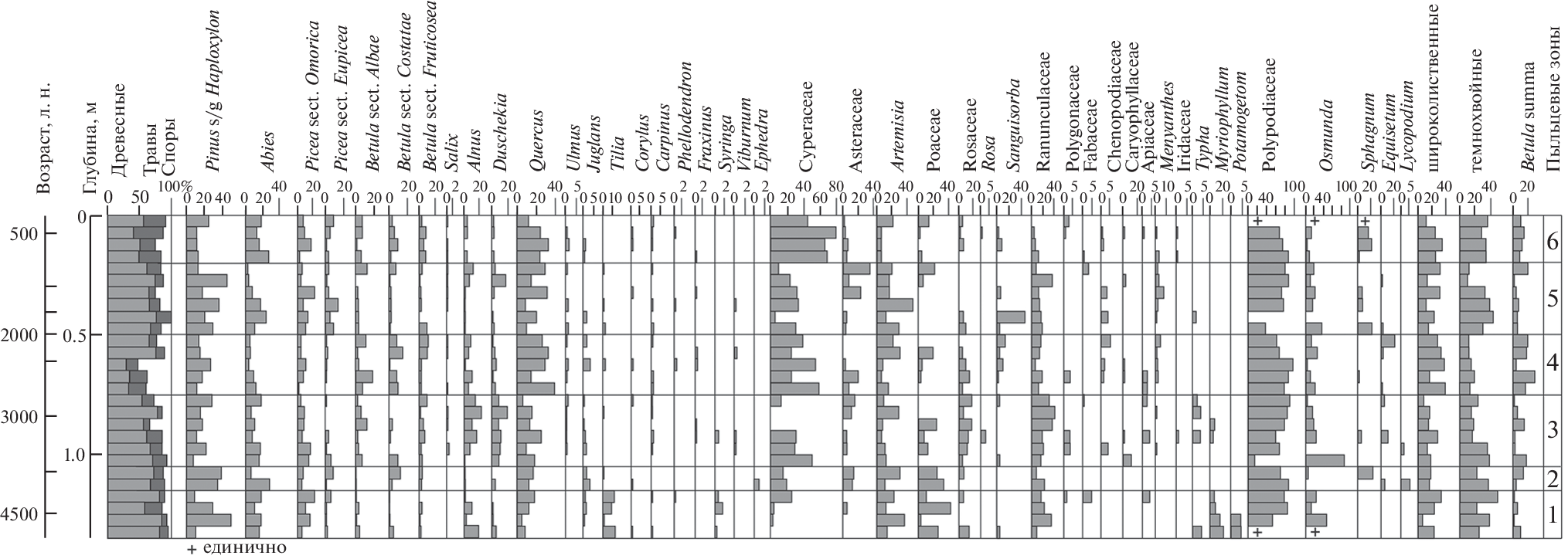 Выделено 6 палинозон, отражающих развитие ландшафтов. В лагунных отложениях встречено много пыльцы хвойных (палинозона 1). Пик пыльцы Pinus s/g Haploxylon , источником которой являлся кедр корейский, возможно, объясняется привносом пыльцы с речным стоком. Увеличение доли полыни и злаков отвечает более сухим условиям. Встречена пыльца водных растений (рдест, уруть, рогоз). В основании торфяника обнаружено больше пыльцы кедра корейского (палинозона 2, 3460–3320 л. н.). В палинозоне 3 (3320–2780 л. н.) увеличивается доля пыльцы локальной растительности – ольхи, ольховника, березы плосколистной. Высокое содержание пыльцы темнохвойных (3320–3140 л. н.) свидетельствует об их активном поступлении в лагунное озеро, связанное с морем, вероятно, за счет водного переноса пыльцы с верховьев р. Раздольная и близлежащих водотоков, берущих начало с Шуфанского плато. Встречено много пыльцы осоковых и лютиковых. Обнаружена пыльца водных растений – рогоза и урути, типичных для пресноводных озер. Пик пыльцы полыни зафиксирован в слое травяного торфа в инт. 0.80–0.85 м (2950–2870 л. н.). В палинозоне 4 (2780–2010 л. н.) увеличивается содержание пыльцы широколиственных, особенно дуба, и берез, часто встречается пыльца вахты. В палинозоне 5 (2010–770 л. н.) содержания пыльцы таксонов сильно колеблются. Выделяются пробы с обилием пыльцы кедра корейского и других темнохвойных пород (2010–970 л. н.). Количество пыльцы трав, представителей сухих местообитаний (полынь, маревые) увеличивается. В отдельных слоях встречено много спор сфагновых мхов (2010–1740 л. н.). В палинозоне 6 (770–380 л. н.) стало больше темнохвойных, много пыльцы осок и спор сфагновых мхов.