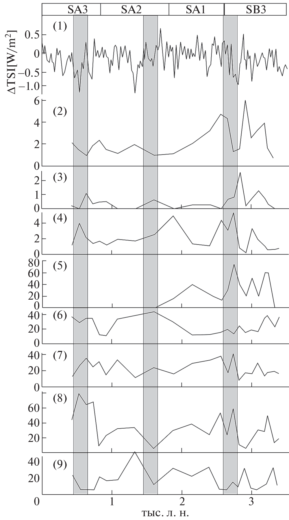 Рис. 6. Динамика солнечной активности на основе измерения 10 Be в полярных льдах, по (Steinhilber et al., 2009) и изменения в составе биотических компонентов на побережье Амурского залива в позднем голоцене (процентные содержания соответствуют рис. 3–5 ). Серым цветом показаны глобальные холодные события по (Wanner et al., 2011). (1) – солнечная активность (Steinhilber et al., 2009); (2) – концентрация створок диатомей (млн/г); (3) – арктобореальные диатомеи (%); (4) – почвенные диатомеи (%); (5) – древесные остатки (%); (6) – пыльца Abies + Picea (%); (7) – пыльца широколиственных (%); (8) – пыльца Cyperaceae (%); (9) – пыльца Artemisia (%). Fig. 6 . The dynamics of solar activity based on the measurement of 10 Be in polar ice, according to (Steinhilber et al., 2009) and changes in biotic components on Amur Bay coast in the late Holocene. Percentages on the curves correspond to fig. 3–5 . Grey bands indicate global cold events (Wanner et al., 2011). (1) – solar activity (Steinhilber et al., 2009); (2) – concentration of diatom frustules (mln/g); (3) – arctoboreal diatoms (%); (4) – soil diatoms (%); (5) – tree remains (%); (6) – pollen Abies + Picea (%); (7) – pollen of broadleaved trees (%); (8) – Cyperaceae pollen (%); (9) – Artemisia pollen (%).