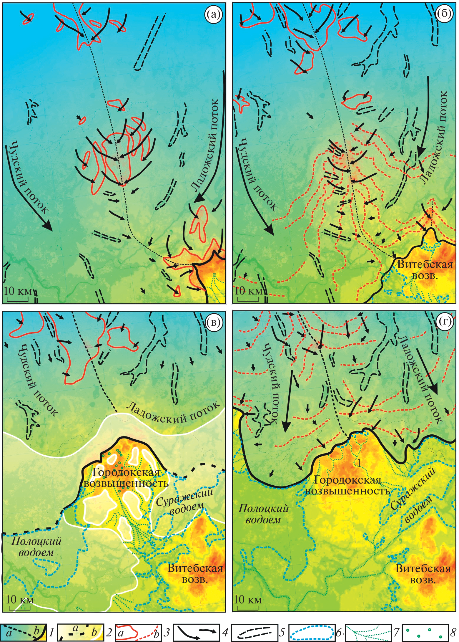 The article presents the results of the first comprehensive study of the structure and morphology of the glacial relief of the Gorodok Upland in the north-eastern Belarus. New data were obtained using lithological-stratigraphic, petrographic and morphometric methods. It has been established that the formation of the upland is predetermined by the uplift in the top of the Upper Devonian rocks. This uplift of the pre-Quaternary surface is overbuilt by Middle Pleistocene glacial deposits with glacial tectonics and erratic masses. The presence of an uplift led to the formation of the upland in the ice divide zone between the Chud and Ladoga Ice Streams during the last glaciation. As a result, during the maximum advance of the last ice sheet, a moraine plateau with kames began to form in the center of the upland. During the Lepel Stage (18–20 cal. ka BP, Edrovo in Russia, Gruda in Lithuania, and Poznan in Poland) the ice lobes of the Chud and Ladoga Ice Streams moved from the periphery to the moraine plateau. In total, there were six distinct oscillations of the glacial edge. As a result, chains of hummocky and ridge end-moraine landforms were formed. Later, during the Braslav Stage (16–18 cal. ka BP, Vepsa in Russia, Baltija in Lithuania and Pomeranian in Poland), hummocky end-moraine landforms were formed on the north-western and north-eastern slopes of the upland. At the same time, large runoff troughs crossing the upland from the north to the south were formed as a result of ice melting. The results of the study are important for the rational conduct of geological surveys and prospecting for mineral building materials within the ice-divide zones of the last glaciation.