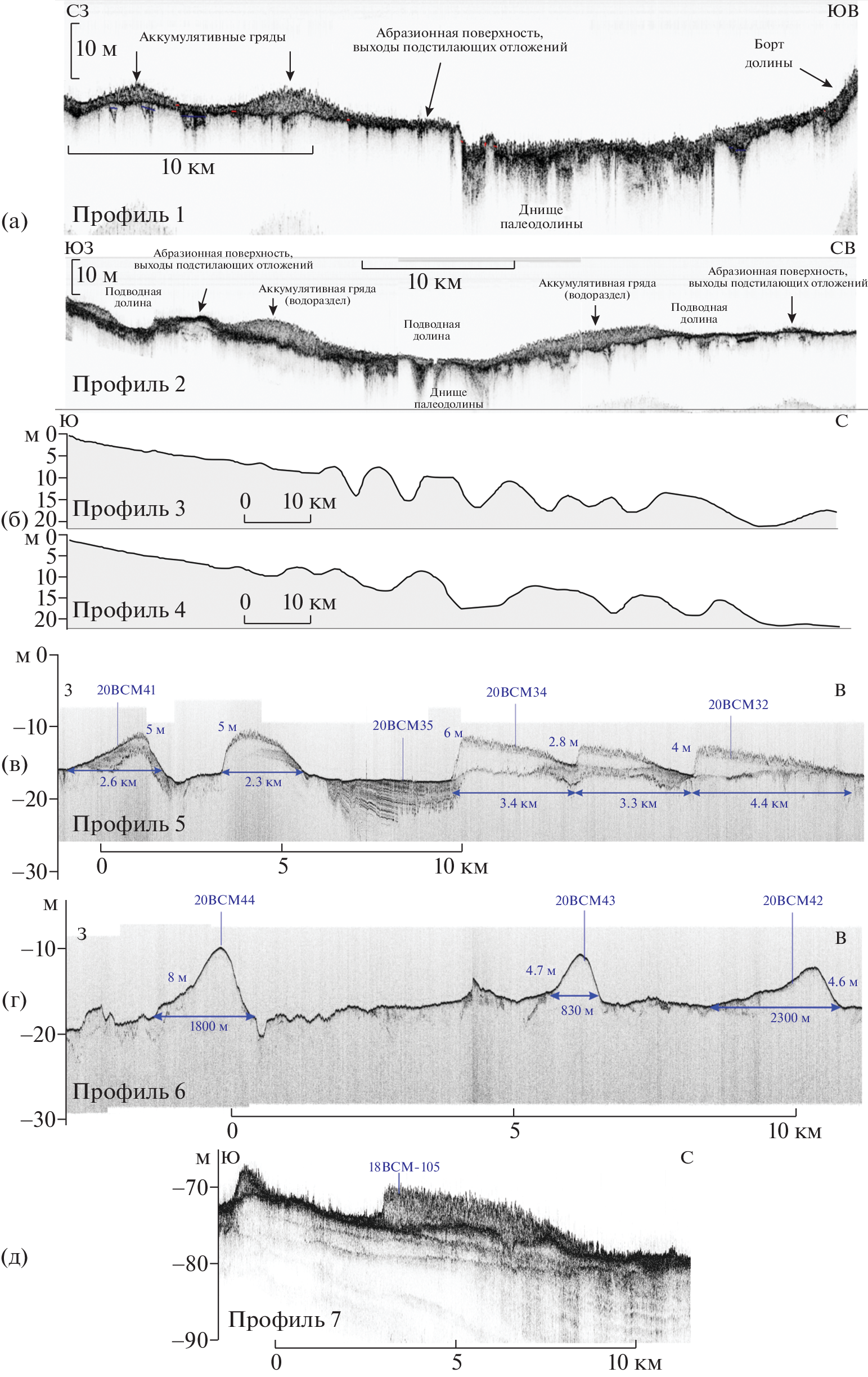 Shelf zone of the East-Siberian Sea is one of the least studied marine areas of the Russian Arctic. One of the important unsolved problems is the existence of a ice sheet in the area of the New Siberian Islands, and the debate about the age and genesis of underwater ridges (bars). Based on geological and geophysical field work condicted by VSEGEI in 2018 and 2020, laboratory research, and data analyses, two types of submarine ridges, principally different in morphology, sediment composition, age, and genesis were identified. Ridges located within the submarine plain on the outer periphery of the submerged valley of the Pra-Kolyma river and around the New Sibir’ Island are asymmetric, have a relative height of 1–2 m to 4–6 m, an average width of 2–4 km (up to a few tens of km) and an average length of 25– 30 km (up to 100 km). According to the sampling data, the ridges of this type are composed of very dense clayey-silt without inclusion of coarse clastic material. The age of the deposits forming the ridges is Late Pleistocene (18–13 ka BP). Formations of the Upper Pleistocene age are exposed in the inter-ridge hollows. The composition, morphology, and age of the ridge deposits suggest that their genesis is associated with denudation processes, but the mechanism of their formation is not obvious. The second type of ridges includes a system of coastal bars located at a distance of up to 30 km from the coast of New Sibir’ Island and composed of fine-grained, well-sorted sands. The width of the ridges varies from 1 to 2 km, the height is from 4 to 8 m, and the length is 10–15 km. The ramparts have a slightly asymmetric shape, with a gentler slope from the side of the island. This system of ridges was formed as a result of accumulative processes in the Holocene. The obtained data do not support the hypothesis of the extension of the Late Pleistocene ice sheet to the shelf.