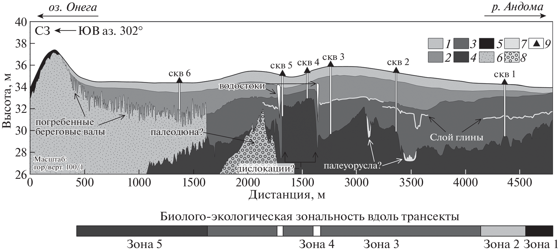The post-glacial development of the Lake Onega coast, together with modern processes, creates conditions for the formation of complex coastal ecosystems that may be vulnerable to possible climate change and anthropogenic impacts. Such systems include wetlands extending along the eastern and southern coasts of Lake Onega. The area of a special interest is near the mouth of the Andoma River, as it combines the influence of the riverbed processes of a large river, the dynamics of the coast of Lake Onega, and peat lands development. The aim of the research was a detailed study of the structure of the Holocene deposits in the lake-river interval on the northern bank of the Andoma River, which reflects the stages of formation and variability of the natural conditions of the lakeside lowland. A reference transects including 4,800 m long GPR profile, supplemented with boreholes was created. The complex study of GPR cross-section and peat cores revealed the internal structure of the peat bog. A plateau-like uplift of the mineral base of the bog, framed by rupture zones with accompanying watercourses, was found. This area is considered as a deformation formed because of glacial dislocations or because of neotectonic deformations. Besides the main structural elements, local erosion incisions accompanied by sandy deposits, which could be confined to the buried paleochannels of the Andoma River, were found at the top of the limno-alluvial sediments. Analysis of the complex transect together with a vegetation description showed a difference in biological and environmental conditions zones, which contribute to biological diversity of the study site. In the future, the reference transects development provides a basis for the initial identification of vulnerabilities and long-term monitoring of the ecological transformation of ecosystems.
