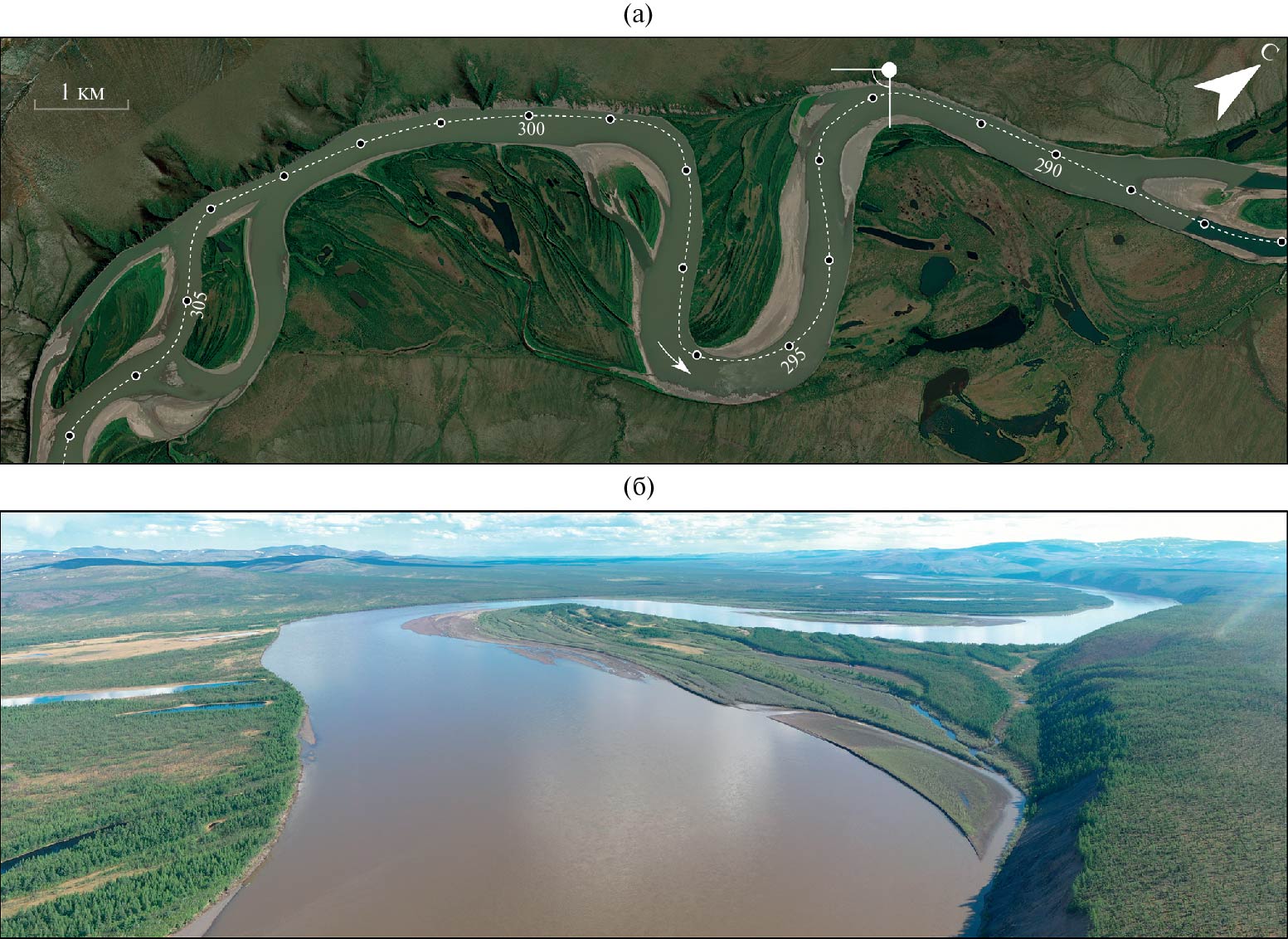 На участке “Пороги”, где р. Яна входит в пределы внутригорной впадины, долина реки расширяется, в том числе до 3 км на уровне днища долины (русло, пойма и пойма-терраса), ограниченного уступами высоких террас с коренным скальным цоколем (рис. 2, (а)). В строении поймы и поймы-террасы отчетливо прослеживаются вытянутые вдоль долины бывшие острова, понижения между которыми представляют собой широкие ложбины, по которым в многоводные фазы режима поступает вода из русла. Рельеф поймы реки отражает развитие русла Яны, представляя собой четыре уровня, в каждом из которых дешифрируются остров и примыкающие к нему пойменные гривы, образовавшиеся благодаря причленению побочней. Ориентировка бывших островов и пойменных грив, в свою очередь, свидетельствует о развитии излучин русла. Использование гривистого рельефа пойм по его отображению на аэро- и космических снимках для восстановления положений русла обосновано еще И.В. Поповым (1955). Применение этого подхода позволило проследить смещение и изменение формы излучины за время формирования поймы и перемещение ее вершины к правому борту днища долины.