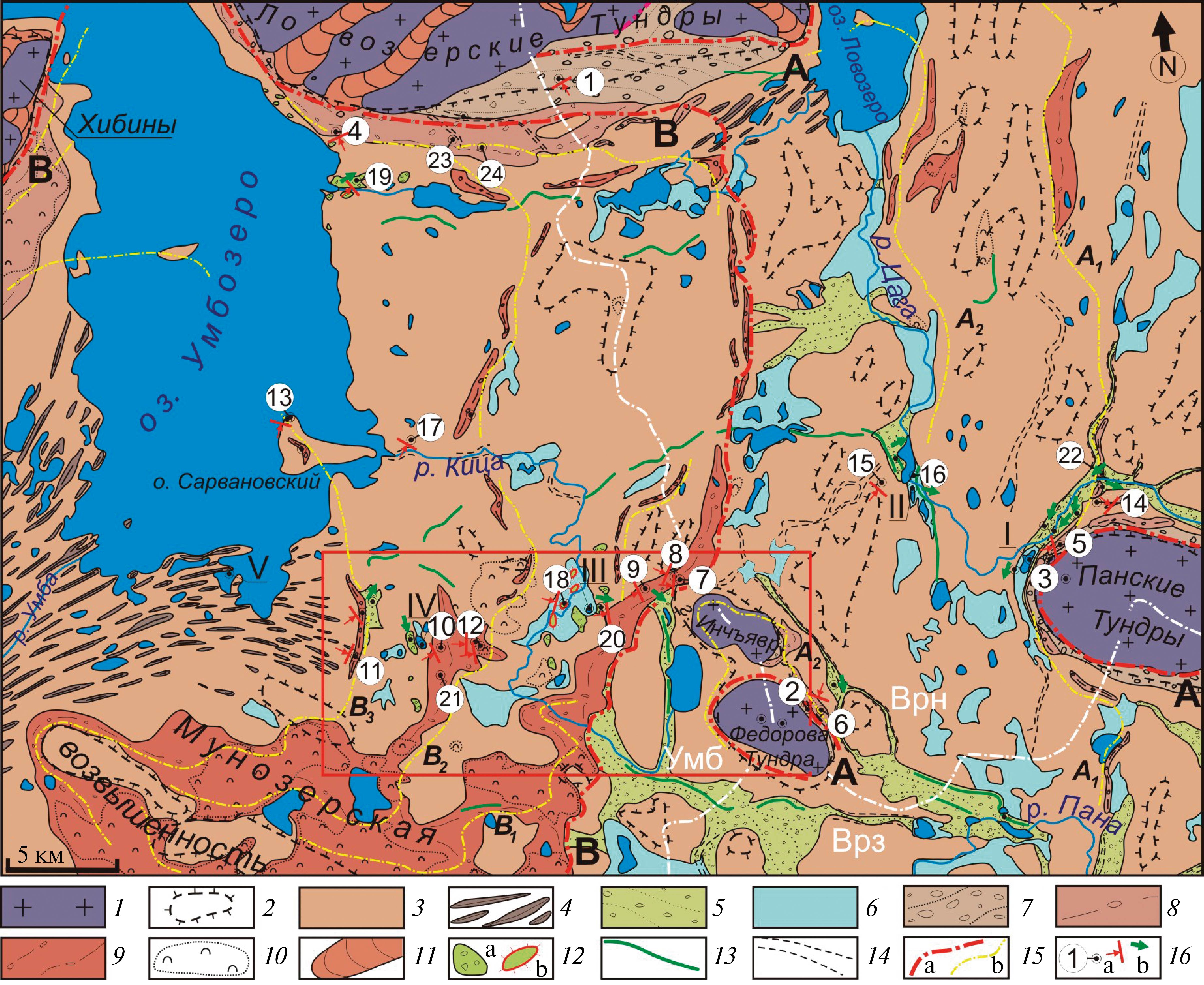 Рельеф, связанный с поднятиями дочетвертичной поверхности: 1 — низкие горы (массивы), не перекрытые четвертичными отложениями (1a в табл. 1), 2 — средние и крупные холмы с чехлом четвертичных осадков (2b); равнинный рельеф: 3 — моренная равнина (2a), 4 — то же, с друмлинами и флютинг-моренами (2b), 5 — флювиогляциальные равнины (2с), 6 — озерно-ледниковые равнины (2d); грядовый и грядово-холмистый ледниковый рельеф: 7 — параллельно-грядовый склонов низких гор (3a), 8 — холмисто-грядовый склонов низких гор (3b), 9 — грядово-холмистый (3с), 10 — холмистая морена, включая грядово-кольцевые формы (3d), 11 — гряды и холмы троговых долин (3e); отдельные положительные формы рельефа: 12 — камы (а) и гляциодиапиры (b) (4a), 13 — озы (4b); 14 — ложбины стока талых вод; 15 — границы выделенных полос А и В (а) и субпараллельные им цепочки (b); 16 — пункты исследований и их номера, реконструкция направления давления ледника (а) и направления течения потоков талых вод (b). Номера исследованных озерных котловин даны римскими цифрами. Белые линии — положение водоразделов бассейнов рек: Умб — Умба, Врз – Варзуга, Врн — Воронья. Красный прямоугольник — ключевой участок морфометрических исследований.