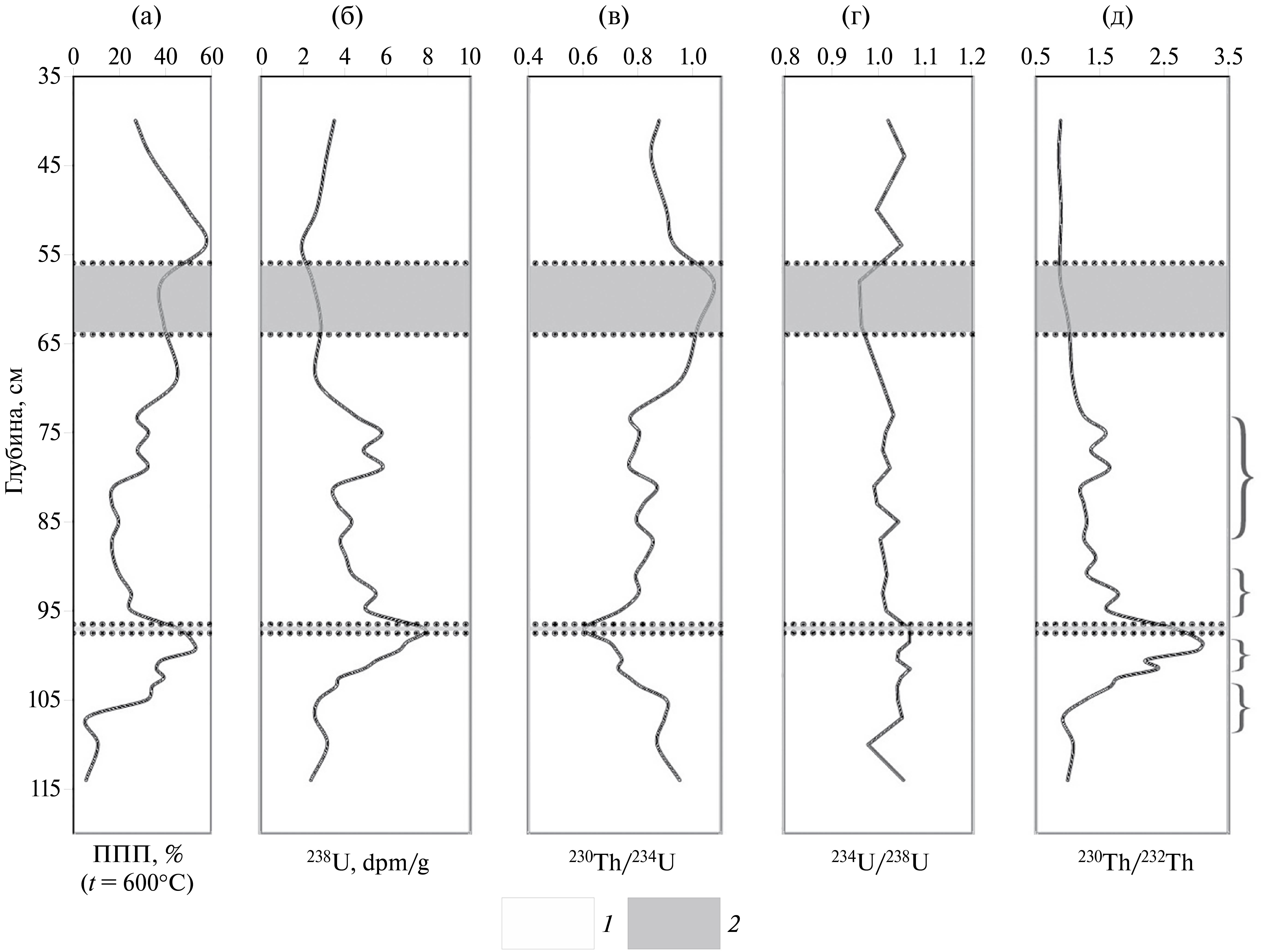 Рис. 4. Распределение органического вещества (ППП — потери при прокаливании), U и отношений активностей ²³⁰Th/²³⁴U, ²³⁴U/²³⁸U и ²³⁰Th/²³²Th по вертикальному профилю озерно-болотной толщи разреза “Большая Дубенка”. Фигурными скобками показаны участки, выбранные для ²³⁰Th/U-изохронного датирования.