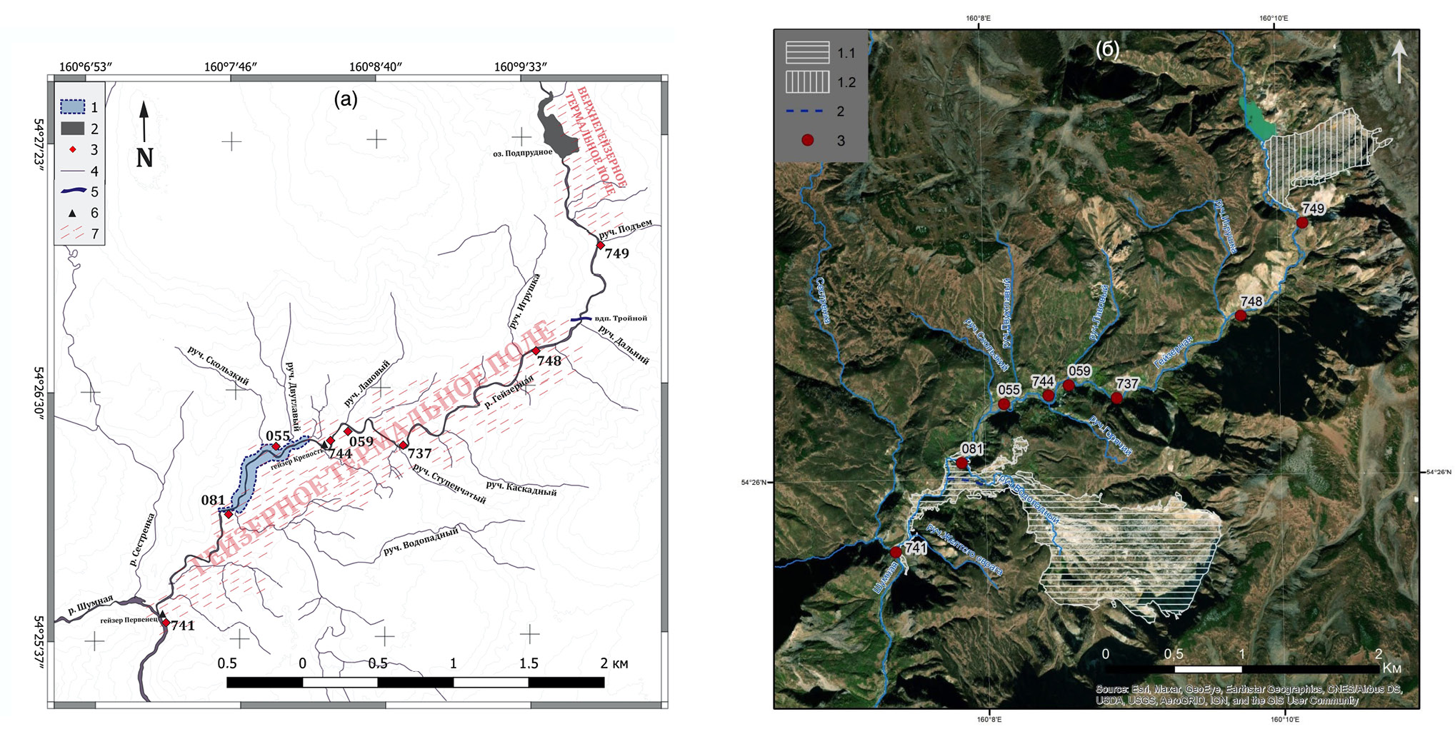 Fig. 3. Basin of the lower and middle reaches of the Geysernaya River. (a) – Propagation of thermal fields. Dammed lakes: 1 – drained (2007–2014); 2 – existing since 2014; 3 – position of sections; 4 – watercourses; 5 – Troynoi waterfall; 6 – geysers Krepost’ and Pervenets; 7 – thermal fields. (б) – Areas of modern gravitational processes. Landslides: 1.1 – 2007, 1.2 – 2014; 2 – position of the buried stream bed of Vodopadny creek; 3 – position of sections