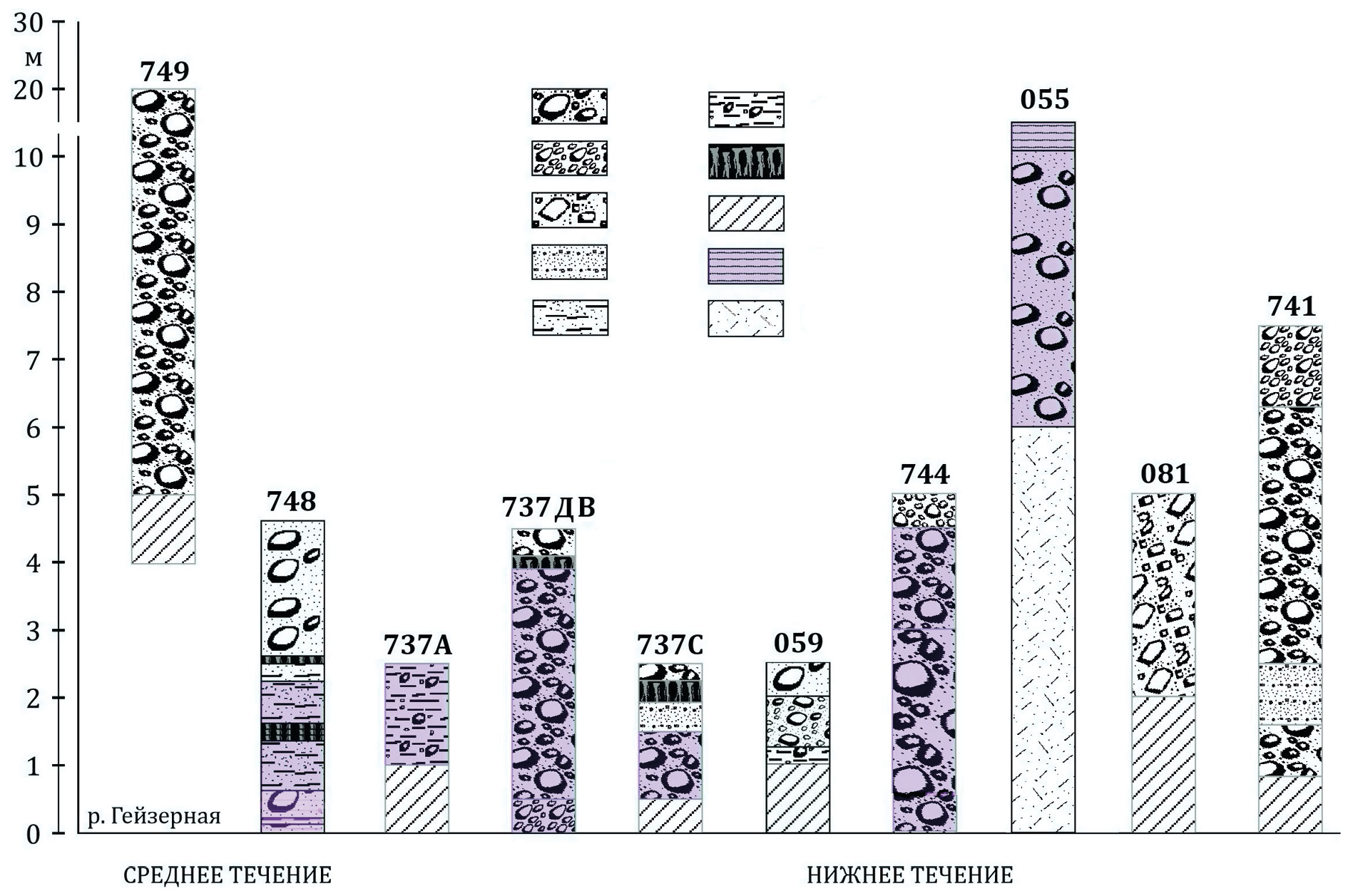 Опираясь на эти данные (табл. 1), литологический состав отложений изученных разрезов, результаты дешифрирования снимков и полевых геоморфологических наблюдений, мы можем заключить, что низкие террасовидные поверхности в долине р. Гейзерной имеют сложное строение разрезов, которые включают несколько генетических типов отложений: селевые, аллювиальные, подпрудно-озерные и переходные – аллювиально-селевые и аллювиальные с переотложением более древнего окатанного материала (см. табл. 2). Исключение составляют разрезы 748 и 081, целиком сложенные современным селевым материалом.