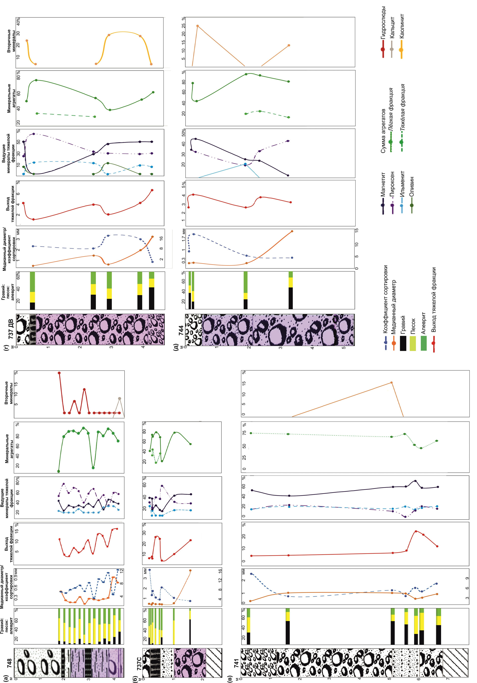 В ряде разрезов (т. 748, 737С) присутствуют прослои горизонтально-слоистого супесчано-гравийного материала – следы существования временных подпрудных водоемов. В минералогических спектрах этих отложений расширяется набор вторичных минералов и спектр агрегатов (табл. 2, рис. 4). В частности, там обнаружены каолинит, кальцит, гидрослюды, гейзерит, гипс, карбонаты, цеолиты, смектит. Наряду с опал-смектит-цеолитовыми агрегатами в различных горизонтах встречаются опал-смектитовые, каолинит-смектитовые, цеолит-смектитовые агрегаты, смектит-опаловидные агломераты. В отдельных горизонтах до 100% легкой фракции составляют слаболитифицированные песчано-глинистые агрегаты, иногда с системой трубчатых ходов, пузырчато-дырчатой поверхностью, что свидетельствует о газогидротермальной деятельности, продолжавшейся в условиях подпрудного водоема. Подобные явления мы наблюдали и на участке спущенного озера 2007–2014 гг. (Lebedeva et al., 2023). Прослеживаются здесь и прослои сортированного песка (S0=1.6–2.8) с повышенным выходом тяжелой фракции (до 13–29%). Аналогичные по характеристикам прослои встречаются и в разрезе 741. По заключению Э.Г. Ананьевой (1998), это осадки заполнения небольших русел, типичные для конусов выноса и внутренних дельт в пределах подпрудных озер. Условия осадконакопления в подпрудных водоемах достаточно изменчивы, но аккумуляция идет быстро: в водоеме, просуществовавшем всего лишь около 7 лет, в створе гейзера Большой за это время накопилось около 7–8 м отложений (Lebedeva et al., 2023).