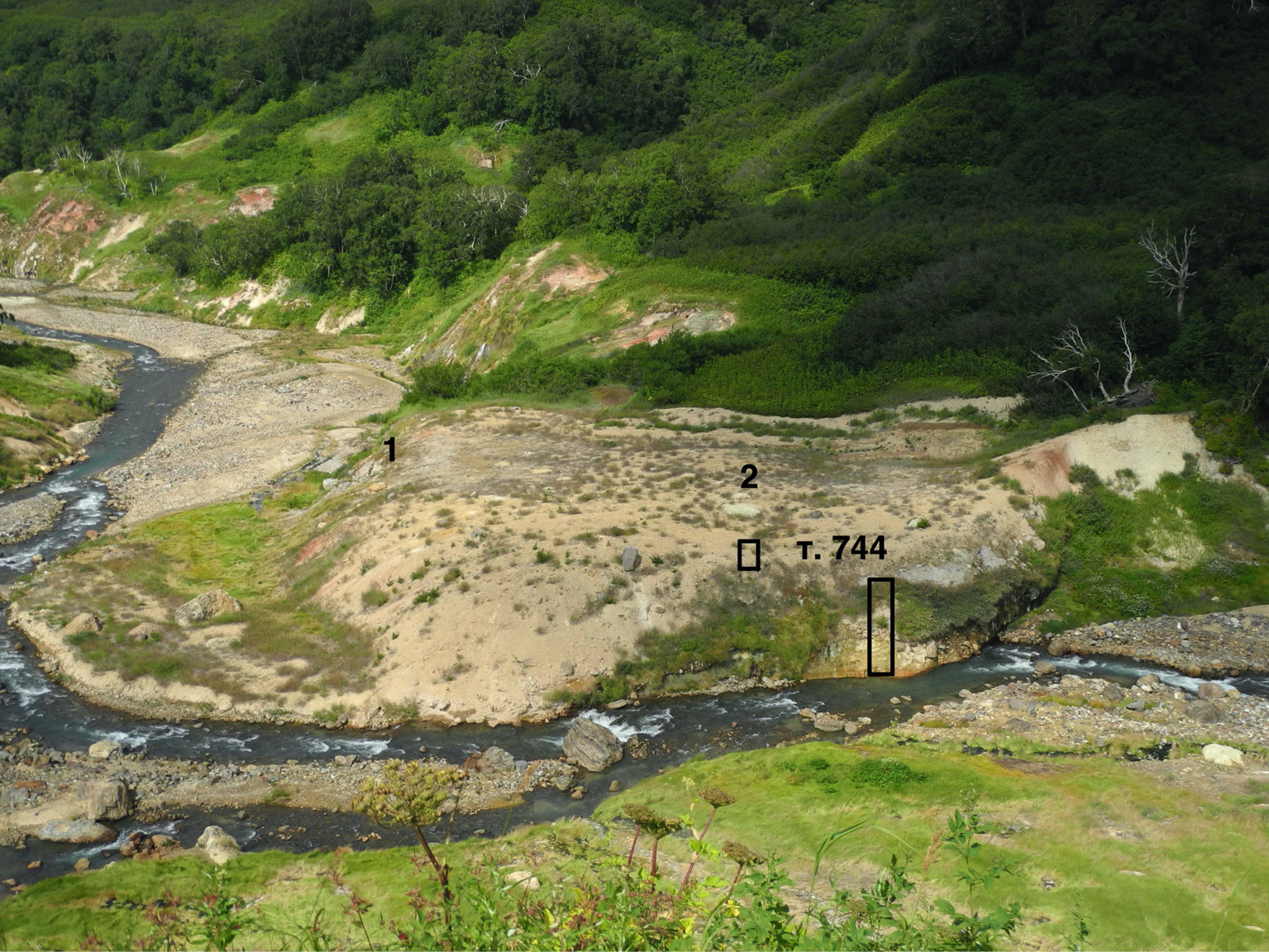 Fig. 10. Section of 7.5 m terrace at the Geysernaya River mouth (point 741). In the foreground (black arrow) is the Pervenets geysernaya