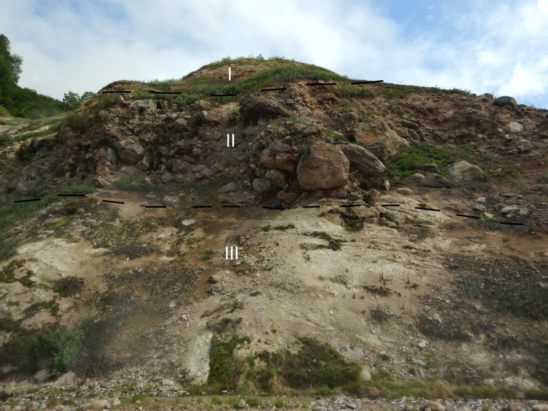 Fig. 8. Structure of the terrace at the point 055: debris flow deposits (II), overlying volcanogenic-lacustrine tuffs of the geysernaya formation (III) and overlain by slope material (I)
