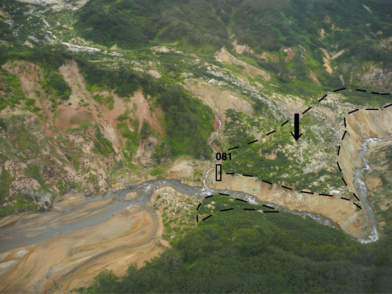 Рис. 9. Положение разреза т. 081 в теле прорезанной р. Гейзерной селевой плотины 2007 г. (черная стрелка, фрагменты плотины ограничены пунктиром) близ нового устья руч. Водопадного