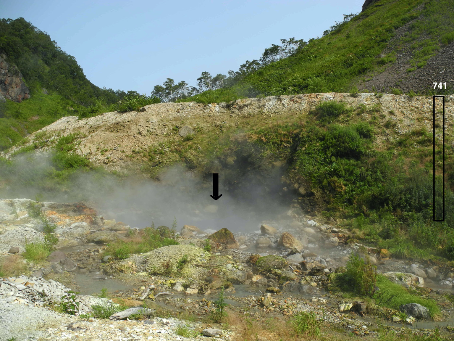 Рис. 10. Разрез 7.5 м ТП в устье р. Гейзерной (т. 741). На переднем плане (черная стрелка) – парит гейзер Первенец