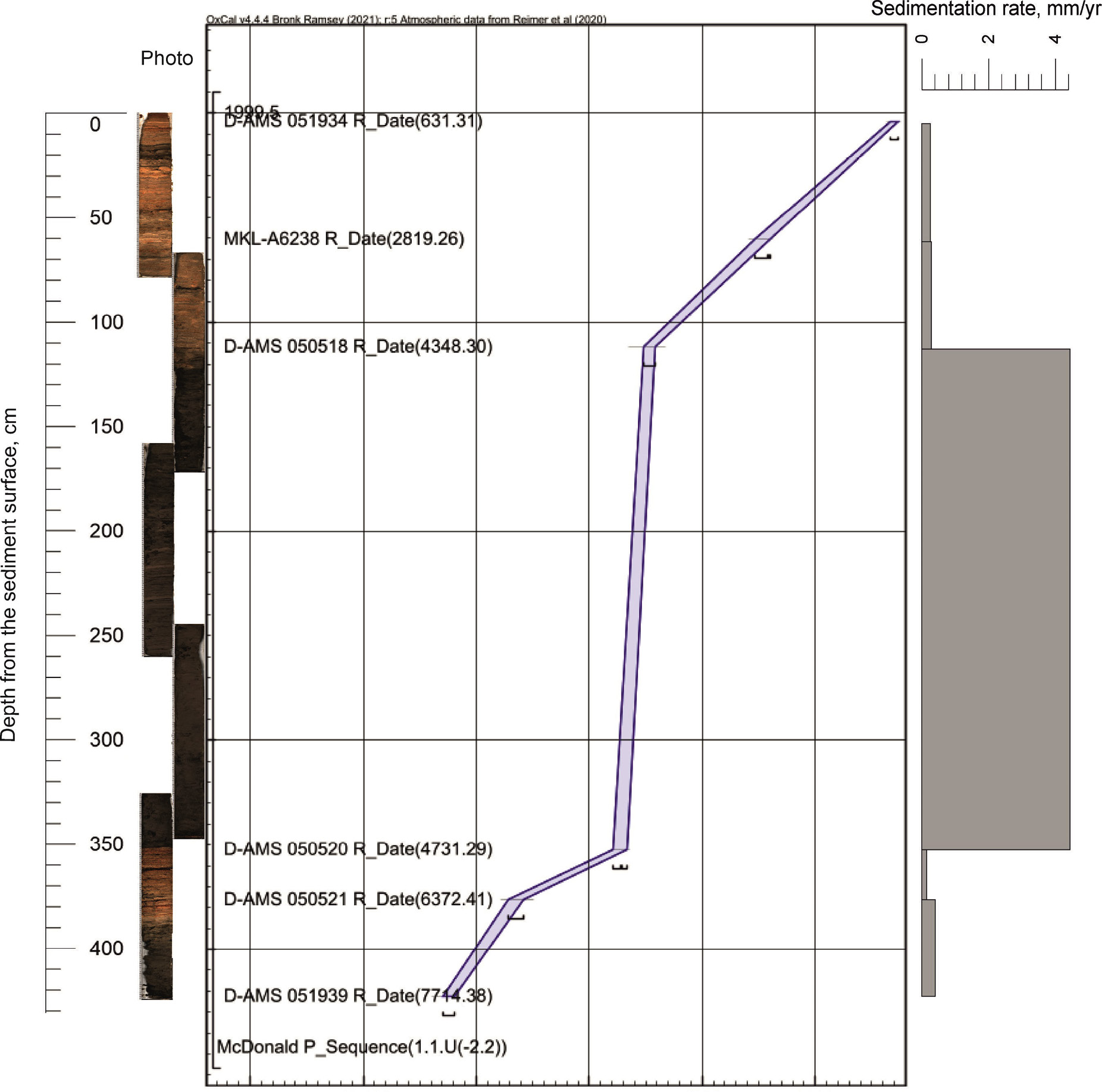 D-AMS 050520 | KDG-17 | 352–352.5 | Sediment (bulk) | 4731±29 | 5326–5580 | 5474 |