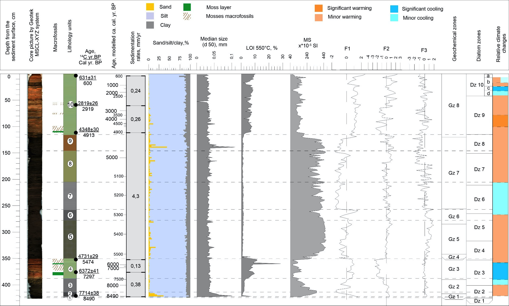 The U7 deposits differ from U6 by a slightly increased sand fraction proportion and consistently low values of the geochemical factor F1 (lower part of Gz 7), indicating an increase in the terrigenous material inflow and the predominant oxidative conditions. This pattern indicates a slight warming and an increase in the ice-free period. At the same time, the discontinuity of sediment intervals with a high sand content, high amplitude fluctuations in MS values, the appearance of lamination indicate the alternation of periods with different sedimentation rates, ice and temperature conditions.