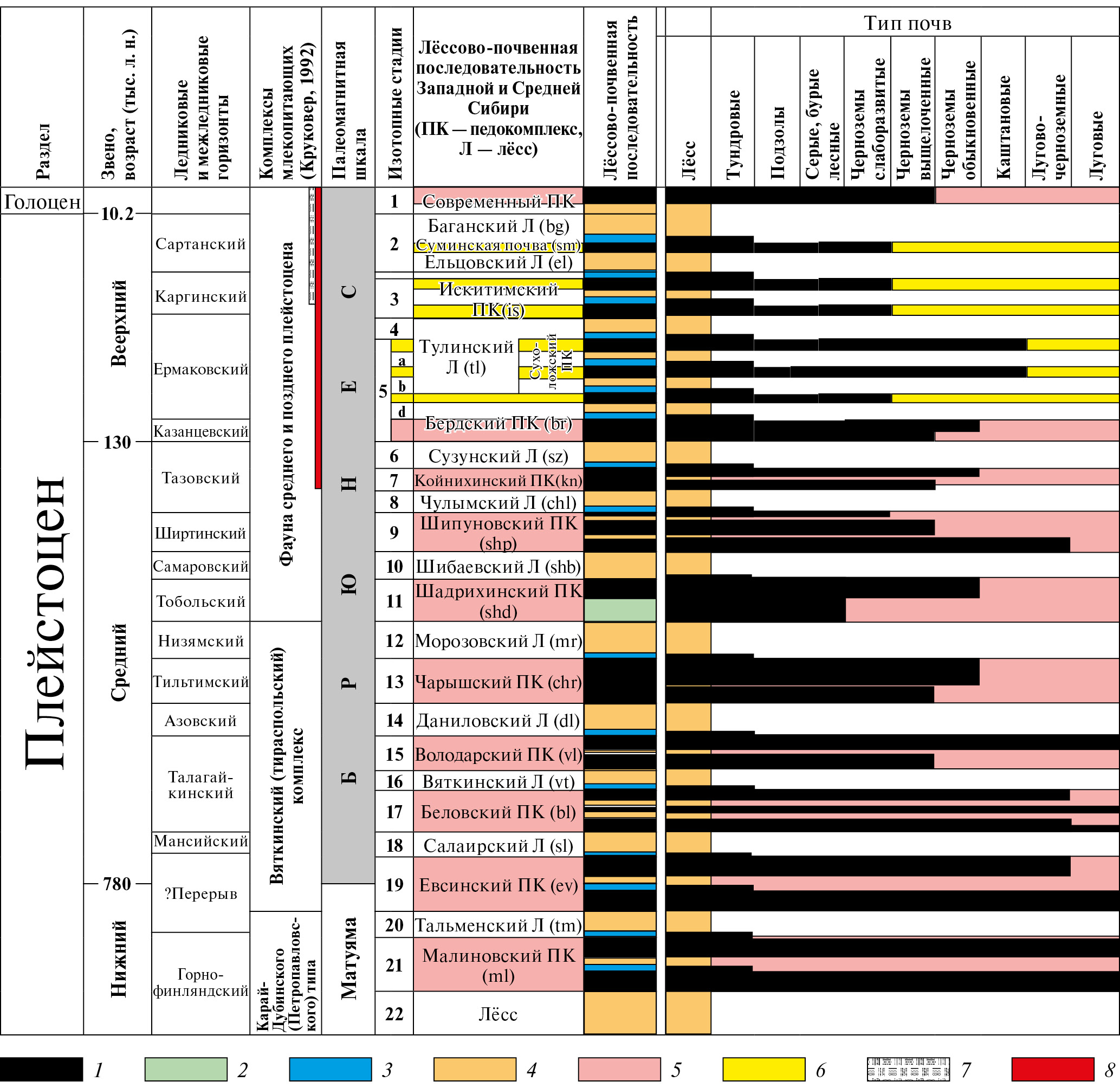 Рис. 1. Стратиграфическая схема лёссово-почвенной последовательности плейстоцена Сибири (Зыкина, Зыкин, 2012, с уточнениями). Горизонты почв: 1 — гумусовые, 2 — иллювиальные; 3 — криогенные образования; 4 — лёссы; 5 — стадии потепления; 6 — холоднее и короче, чем голоцен; интервалы: 7 — имеющие 14С-даты, 8 — имеющие люминесцентные даты; ПК — педокомплекс; Л — лёсс.