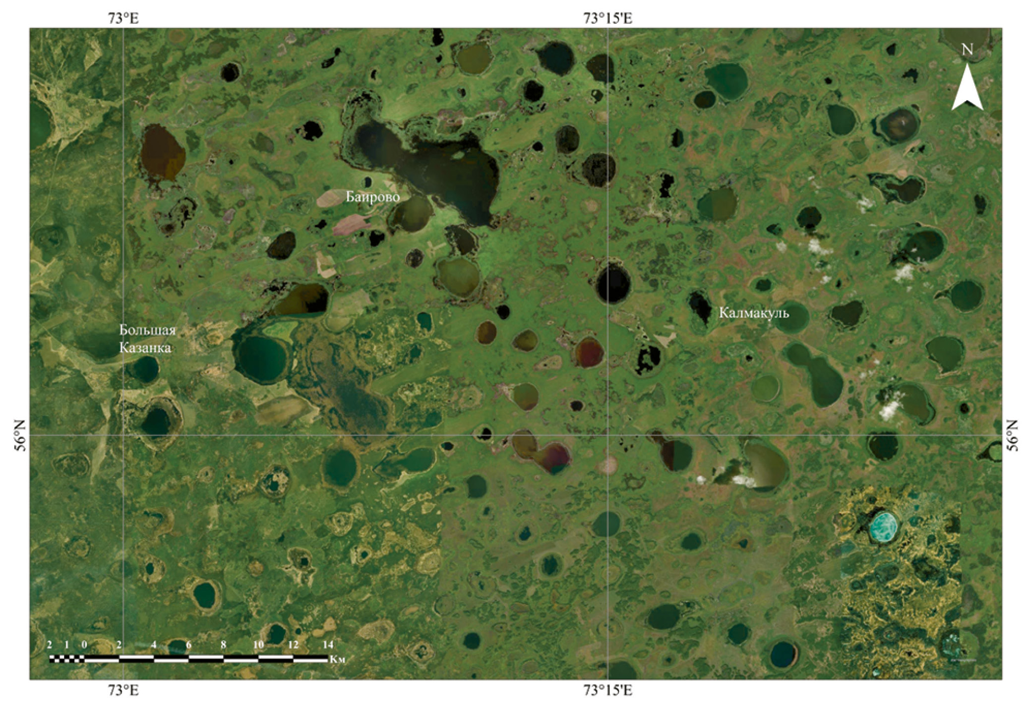 Рис. 2. Дефляционный рельеф времени последнего оледенения в западной части Кулундинской равнины с большим количеством выдутых ветром мелких округлых котловин, заполненных в настоящее время водой (источник: ArcGIS Earth).