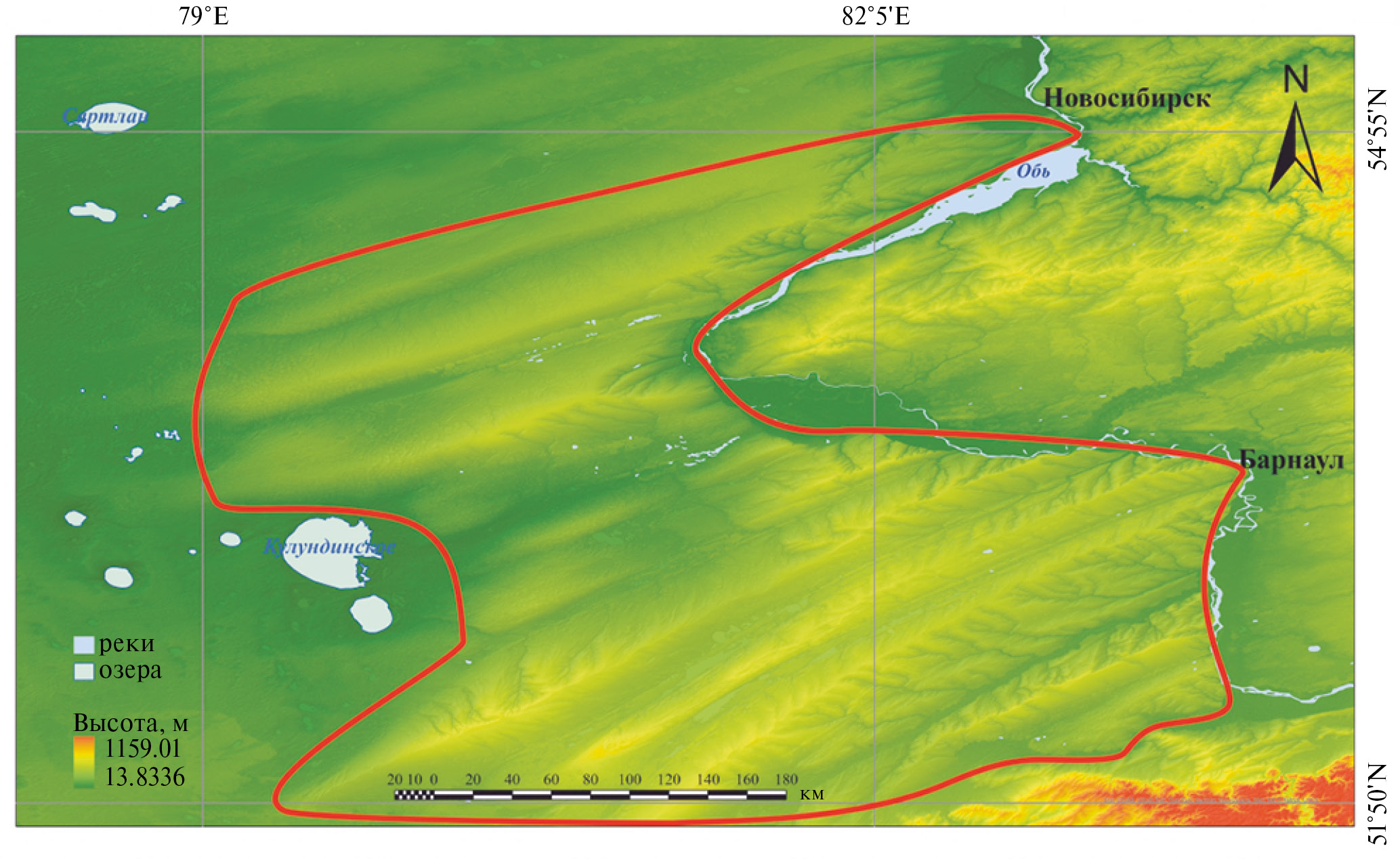 Рис. 6. Гипсометрическая карта увалов Приобского лёссового плато. Увалы (оконтурены красной линией) представляют собой крупные гряды, вытянутые прямолинейно с юго-запада на северо-восток, почти параллельно друг другу. Протяженность увалов достигает 120—350 км, а ширина от 15 до 70 км. Они разделены широкими прямолинейными ложбинами шириной от 8 до 20 км; относительная высота увалов над ложбинами составляет от 5 до 100 м. Гипсометрическая карта выполнена на основе SRTM c разрешением 30 м (источник: https://opentopography.org/). Оформление выполнено в ArcGIS Pro.
