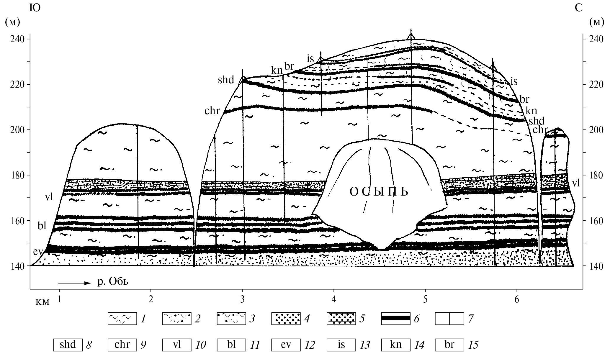 Fig. 7. Geological structure of the Belovo section (Zykina, Zykin, 2012). 1 — loam; 2 — sandy silt; 3 — sandy loam; 4 — sand; 5 — indistinctly layered sand; 6 — fossil soil; 7 — locations of transects; pedocomplexes: 8 — Shadrinsky, 9 — Charyshsky, 10 — Volodarsky, 11 — Belovsky, 12 — Evsinsky, 13 — Iskitimsky, 14 — Koinikhinsky, 15 — Berdsky.