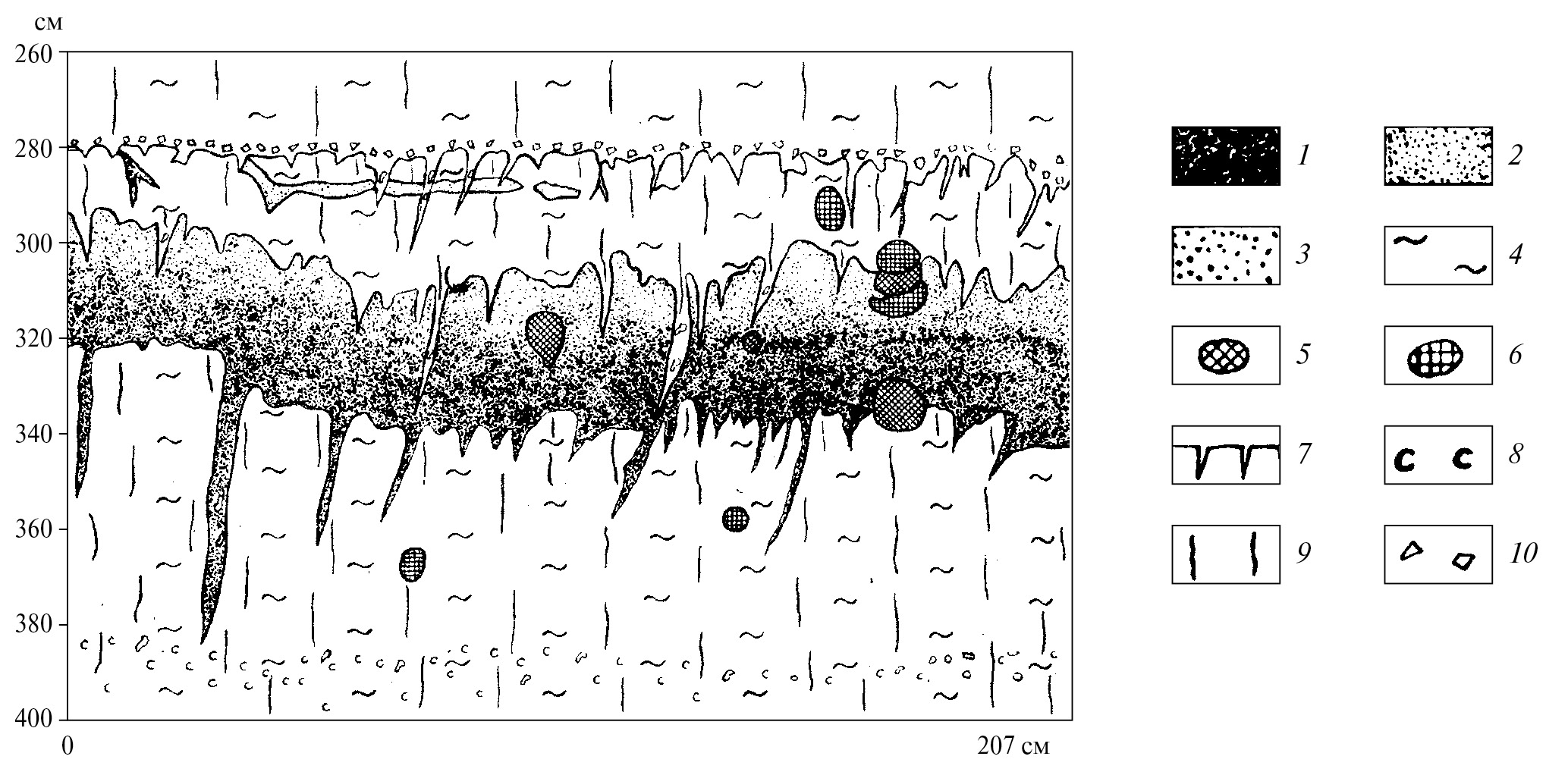 Рис. 8. Строение нижней почвы бердского педокомплекса (МИС 5 е): (а) — карьер Тогучин, (б) — карьер Ложок. Суглинок: 1 — сильно гумусированный, 2 — средне гумусированный, 3 — слабо гумусированный, 4 — лёссовидный; норы землероев: 5 — заполненные лёссовидным суглинком, 6 — заполненные гумусированным суглинком; 7 — трещины усыхания; 8 — псевдомицелий и пятна белоглазки; 9 — вертикальная трещиноватость; 10 — щебень.