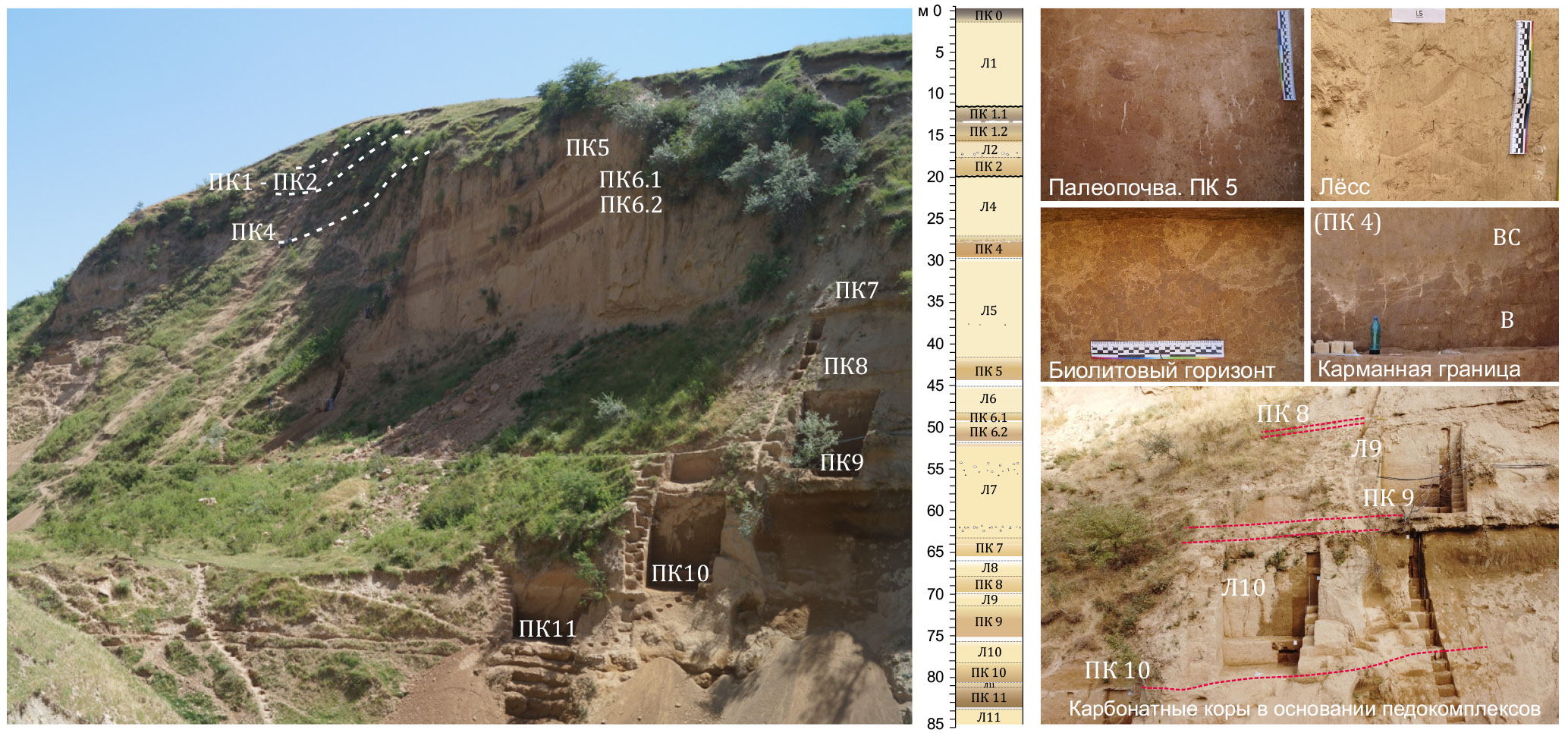Являются интересной особенностью ЛПС региона. Они представлены суглинком средним с комковато-глыбистой структурой, с обилием округлых биолитов-капсул, заполненных более темным материалом. Капсулы являются камерами, образованными в результате жизнедеятельности жуков родов чернотелок (сем. Tenebrionidae) и хрущей (подсем. Melolonthinae) (Ломов, Ранов, 1984; Токарева и др., 2024), их границы подчеркнуты плотными карбонатными стенками. Встречаются горизонты с биолитами-капсулами без плотной оболочки и кальцитовыми новообразованиями внутри, но обилием CaCO3 по порам между биолитами. Также часты кротовины диаметром до 10 см с белесым или коричневым заполнением, зачастую из вышележащих горизонтов. Глубина их проникновения может достигать 1.5 м. Биолитовые горизонты являются переходными толщами, отражающими начальный этап почвообразования в педокомплексе, и указывают на аридные и относительно теплые условия формирования этих горизонтов, в отличие от лёссов (Ломов, Ранов, 1984).