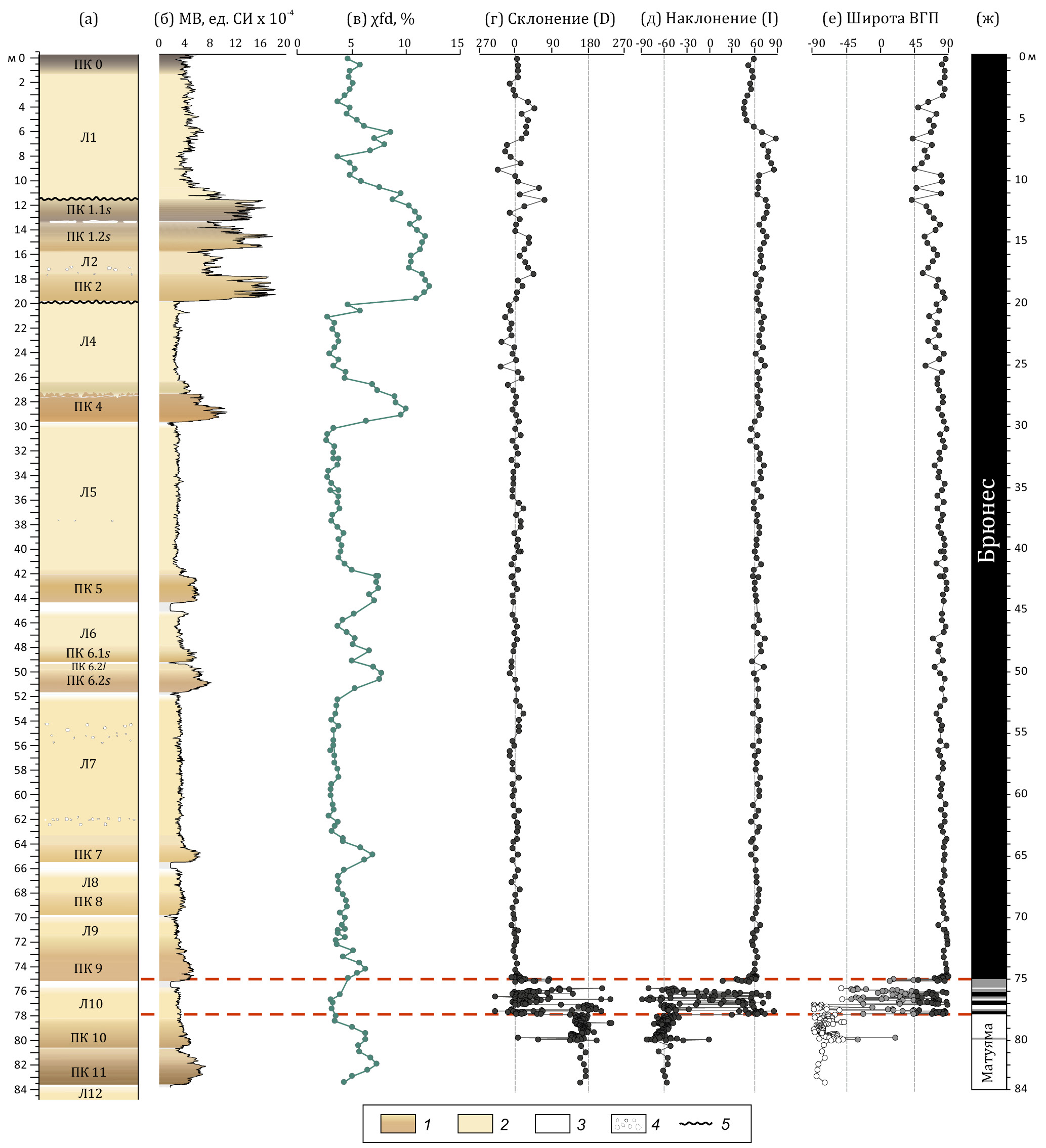 Рис. 3. Литологическая колонка разреза Кульдара (а), кривая полевой магнитной восприимчивости (МВ) (б), частотная зависимость магнитной восприимчивости (χfd, %) (в), кривые изменения магнитного склонения (D) и наклонения (I) (г, д), широта виртуального геомагнитного полюса (ВГП) (е) и магнитостратиграфическая колонка (ж). Эрозионные границы отмечены волнистой линией. 1 — педокомплекс (ПК), 2 — лёсс (Л), 3 — карбонатные коры, 4 — карбонатные конкреции, 5 — эрозионные границы.