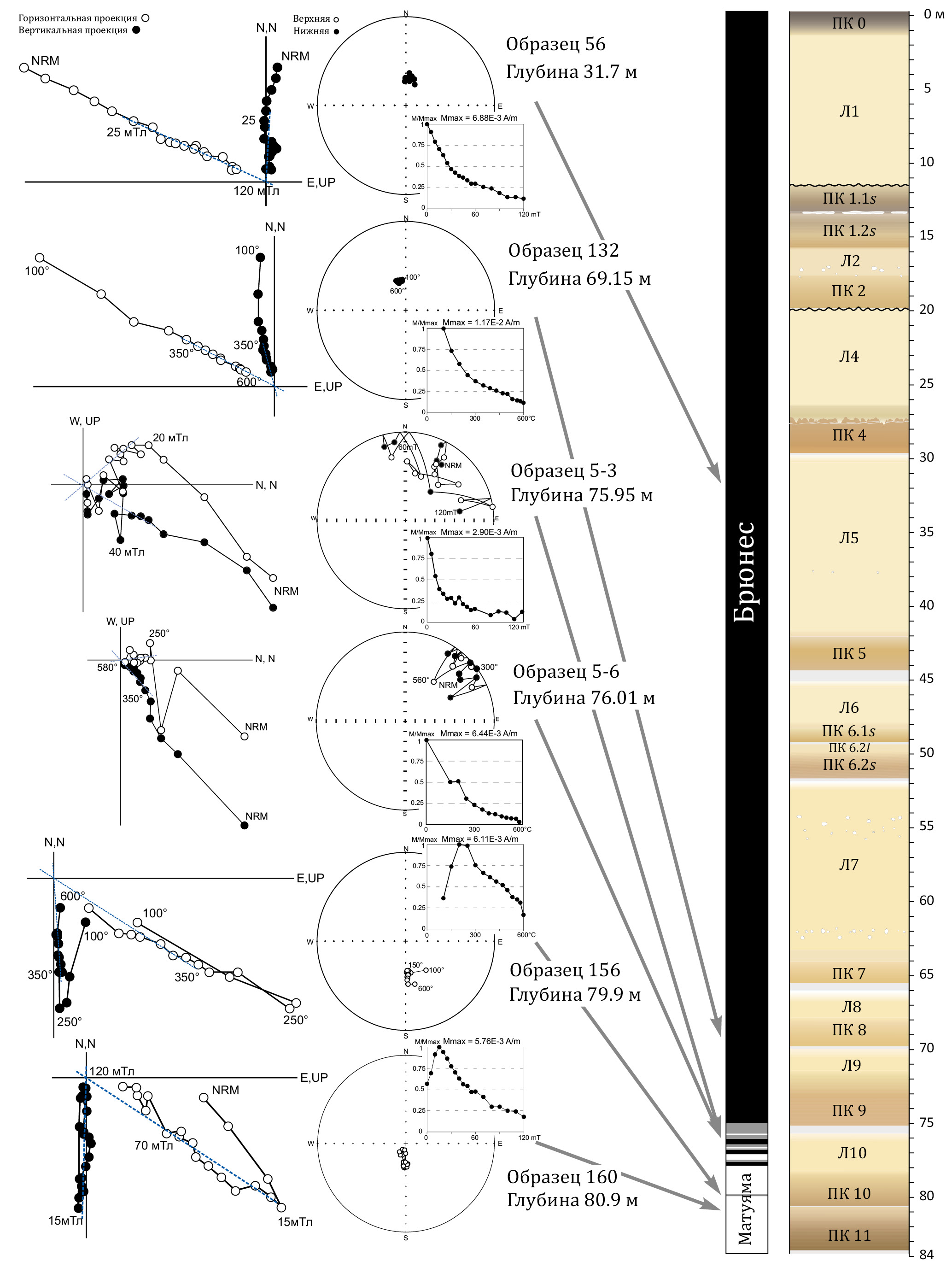 Изученная часть разреза целиком охватывает эпоху прямой полярности Брюнес, переходную зону инверсии Матуяма–Брюнес и верхнюю часть эпохи обратной полярности Матуяма. Ступенчатая магнитная чистка выявляет две компоненты намагниченности в образцах: низкокоэрцитивную/низкотемпературную современную компоненту вязкой природы и высококоэрцитивную/высокотемпературную стабильную компоненту, вероятно, первичной природы, называемую нами характеристической. Для интервалов стабильной полярности Брюнес и Матуяма палеомагнитный сигнал хорошего качества, характеристическая компонента уверенно выделяется в интервале 15(30)–120 мТл и 350—580 °C (рис. 4). Современная компонента часто совпадает или незначительно отличается от направлений эпохи Брюнес (рис. 4, образцы 56, 132), а для обратно намагниченных образцов становится антиподальной (рис. 4, образцы 156, 160). После осреднения выделенных направлений в образцах-дублях с одного уровня были получены кривые изменения палеомагнитных характеристик (склонение и наклонение) по разрезу, а также рассчитанные на их основе широты виртуального геомагнитного полюса (ВГП), представленные на рис. 3, (г–е). Среднее направление характеристической компоненты для прямонамагниченной части разреза: D = 1.7°, I = 63.7° (α95 = 1.2, N = 155), обратнонамагниченной части: D = 168.7°, I = –58.2° (α95 = 3.3, N = 10).