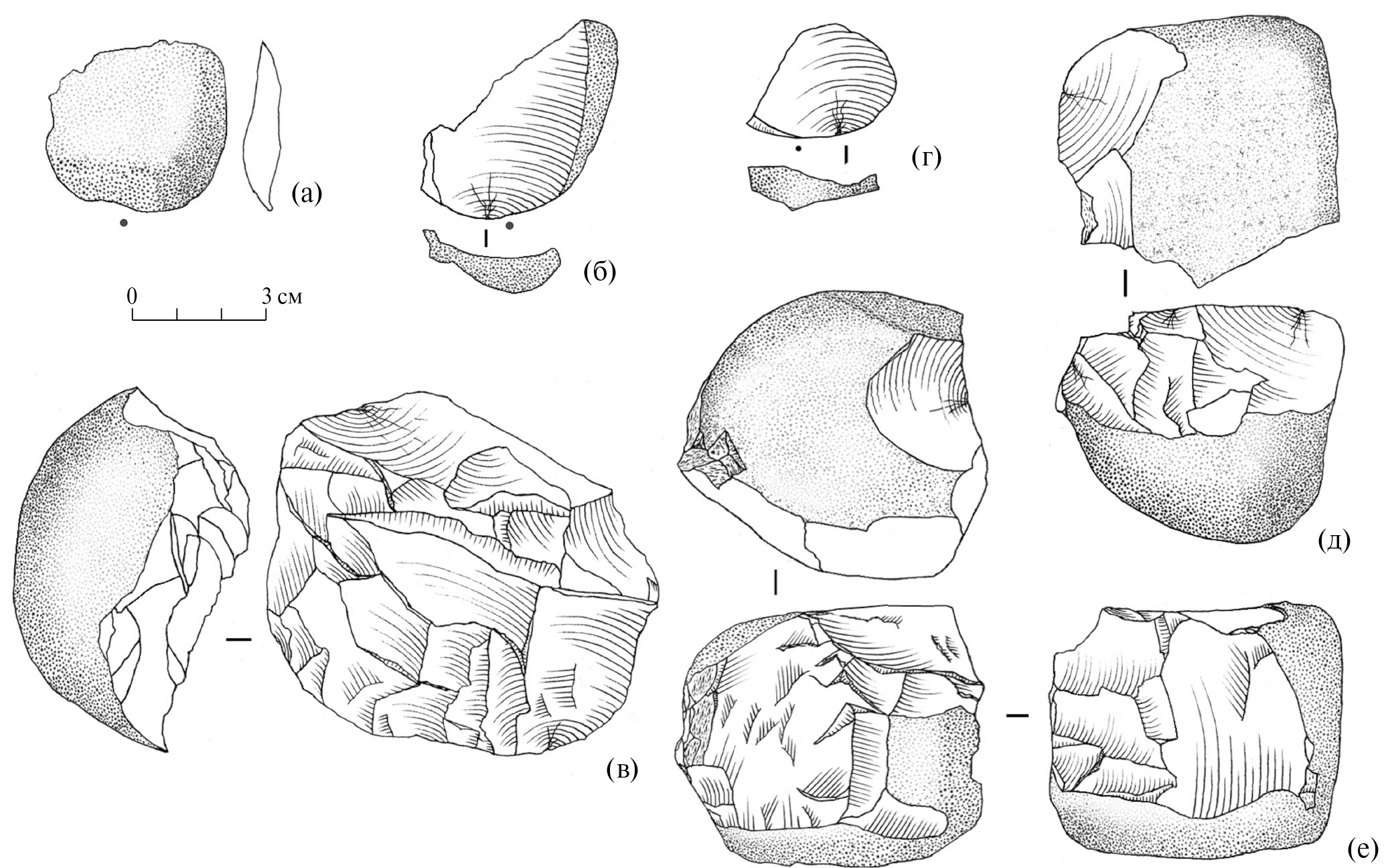 Fig. 5. Archaeological material from the Kuldara site (excavations in 2021): (а) — flake from PC 10; (б) — flake from PC 6; (в) — core from PC 5; (г) — chip; (д, е) — cores from PC 4 (drawing by T. U. Khudjageldiev).