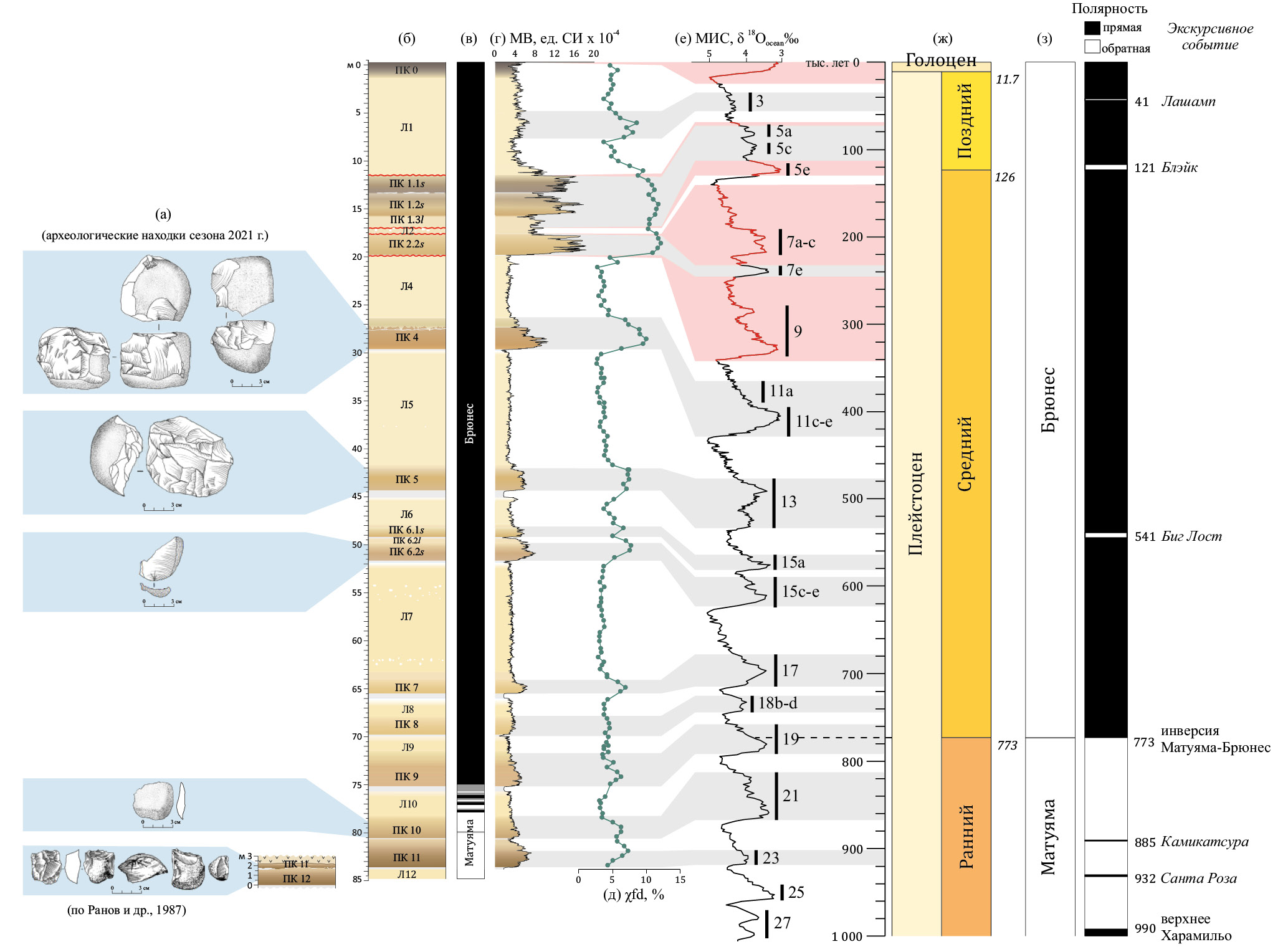Fig. 6. Summary chronostratigraphic scheme of the Kuldara site: artifacts (а), lithologic column (б), magnetic zonality scale (в), magnetic susceptibility curve (г), frequency dependence of magnetic susceptibility (д), marine isotope stages (е), Quaternary stratigraphic subdivisions (ж), and global magnetostratigraphic scale (з). MIS is given by (Lisiecki, Raymo, 2005), geologic scale by (Cohen, Gibbard, 2019).