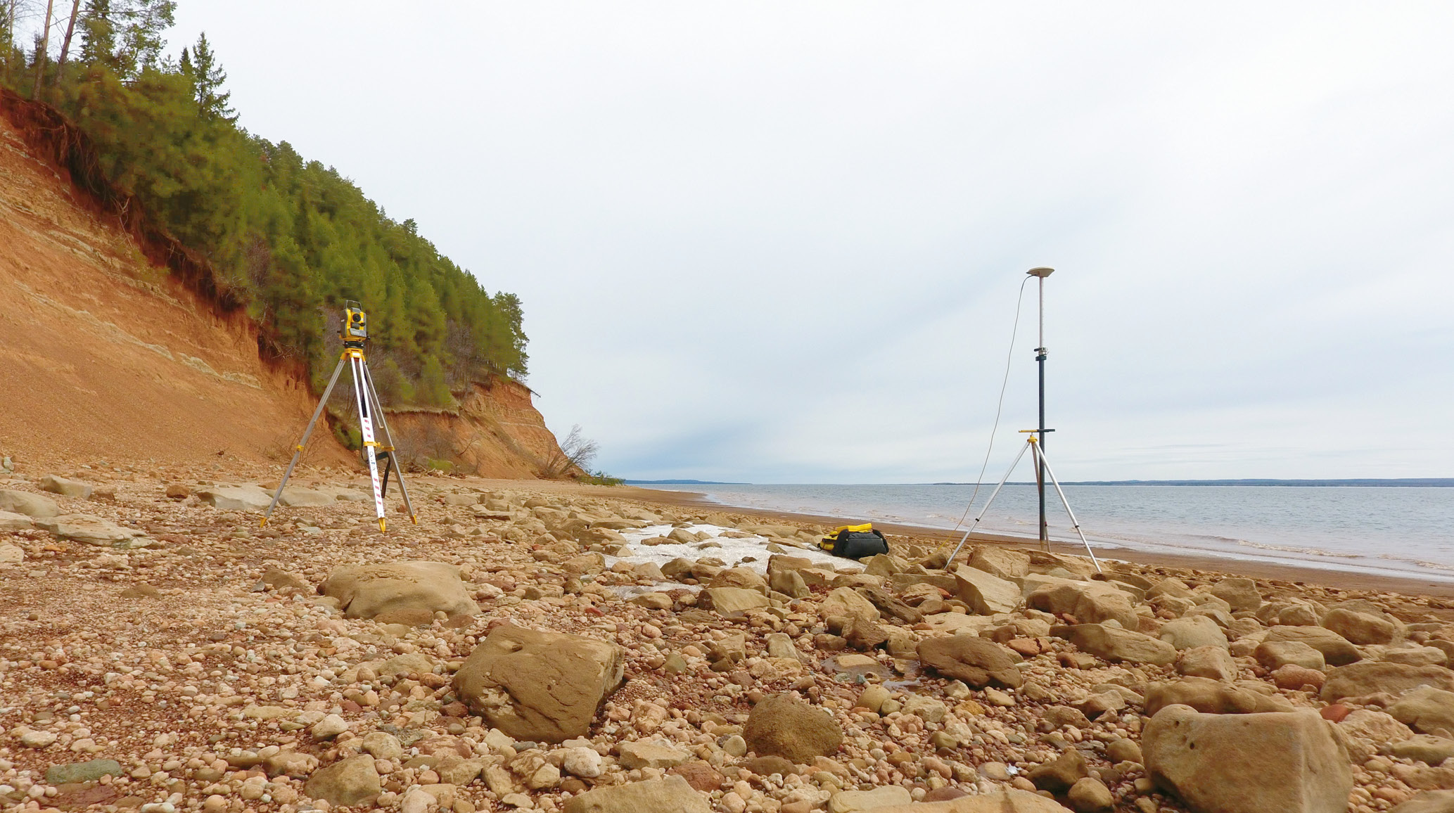 Наблюдения за скоростью отступания берега и медленными массовыми смещениями грунта проводились на мелководье Воткинского водохранилища на стационаре в районе с. Галёво Воткинского района Удмуртской Республики (рис. 1) начиная с 2015 г. На береговом участке длиной более 50 м на мелководье во время сброса воды на водохранилище были закреплены реперы — стержни из арматуры, забитые в грунт. Координаты реперов регулярно проверялись с помощью высокоточного навигационного оборудования (рис. 2).