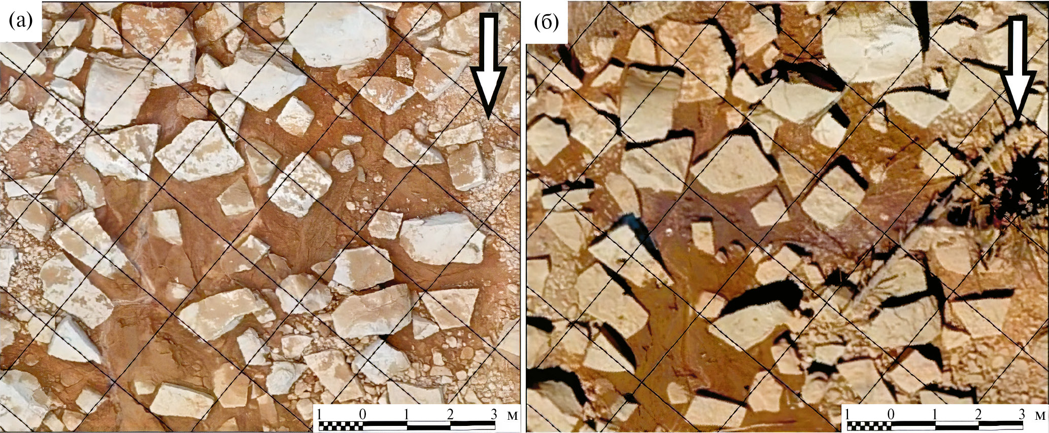 Начиная с 2020 г. для определения величины смещения обломков были использованы материалы съемок прибрежного мелководья с беспилотного летательного аппарата (БПЛА) в период сброса воды и отсутствии ледового покрова в зоне осушки — в третьей декаде апреля (рис. 3). При этом проводилось координирование меченых ранее обломков для сопоставления результатов, полученных разными методами. Съемка производилась с небольшой высоты — 20 м, все снимки в дальнейшем привязывались к единой системе координат, вычисляемой по имеющимся реперам. Планово-высотные координаты реперов ежегодно вычислялись заново, чтобы исключить потенциальную ошибку измерений вследствие возможного их смещения. На распечатанные снимки выносилась координатная сетка, относительно которой и определялись в дальнейшем величины смещения. Для подсчетов выбирались только обломки, надежно идентифицированные на разновременных снимках по их контурам и расположению относительно друг друга. Точность измерений составила ± 1 см. Затем все данные заносились в таблицы и классифицировались по разным признакам — размеру обломков, расстоянию относительно подножья осыпного склона, характеру смещения и поверхности скольжения. Фиксировались смещения по падению склона и общие величины смещения с учетом боковых движений. Всего были получены данные по почти 150 обломкам, что позволяет, на наш взгляд, делать достаточно достоверные выводы о характере и скорости их движений в подводных условиях.