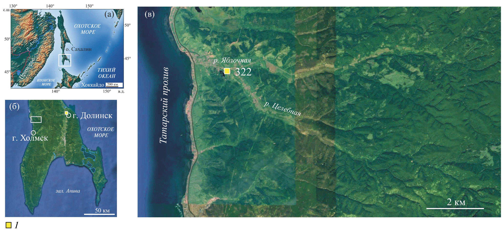 Рис. 1. Схема района работ. (а) — положение о-ва Сахалин; (б) — Южный Сахалин с положением района работ и разреза со следами паводков на восточном побережье острова; (в) — долина р. Яблочной и положение изученного разреза торфяника № 322 со слойками суглинков, оставленных в сильные паводки. 1 — изученные разрезы.