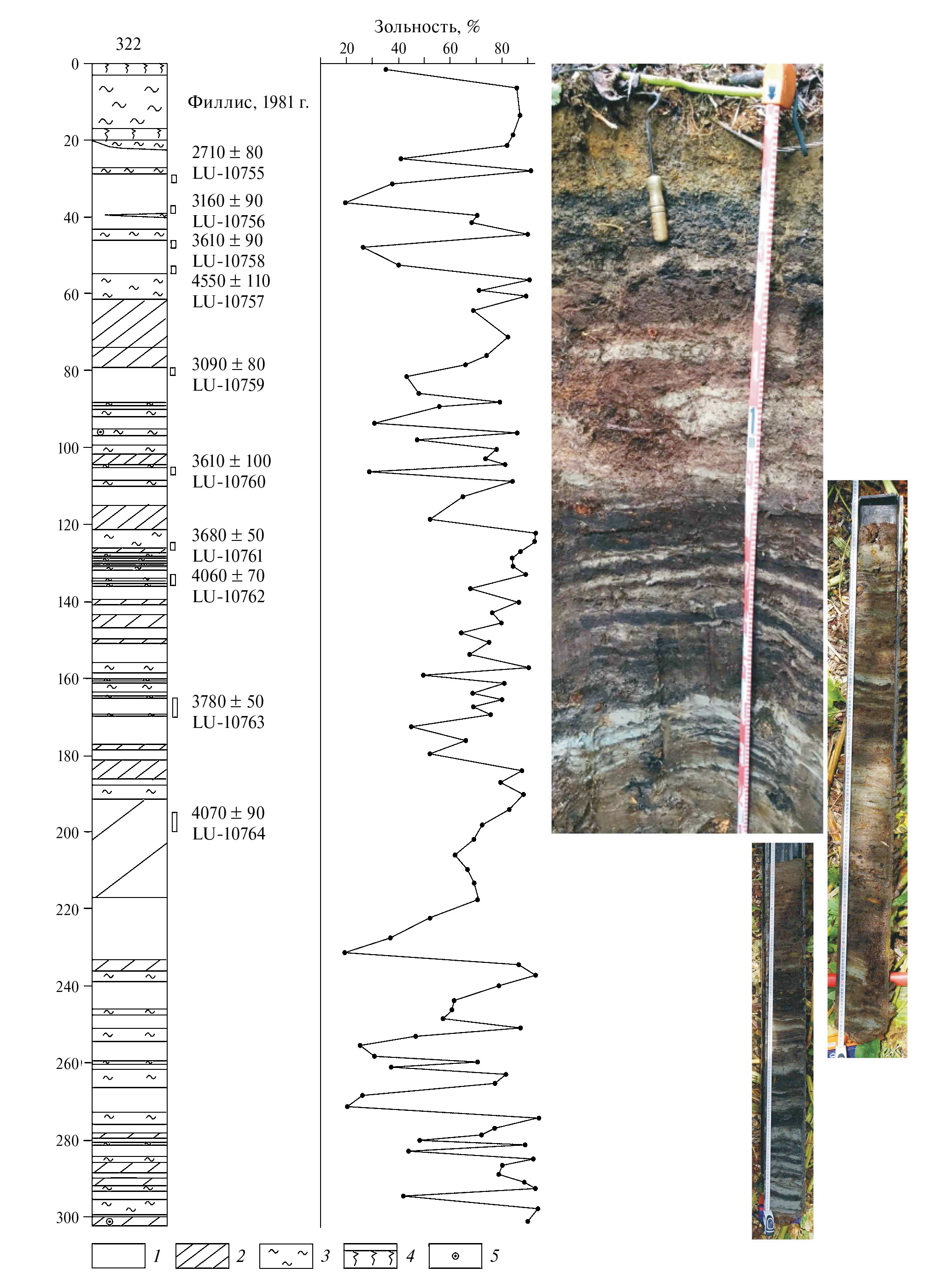 Строение разреза, зольность отложений и возрастная модель. Разрез торфяника (рис. 2) включает 38 слойков светло-серых суглинков, фиксирующих прохождение сильных наводнений за последние 6370 лет согласно возрастной модели (рис. 3). Мощность слойков варьирует от нескольких мм до 4.5 см, верхний слой, образованный в тайфун Филлис, достигает 14 см. Резкое увеличение мощности отложений этого наводнения связано с тем, что долина хорошо освоена с развитием дорожной сети и поселений, что многократно усиливает вынос тонкозернистого материала. Для доисторических событий мощность слоя косвенно отражает интенсивность наводнения и зависит от объема принесенного эродированного материала и длительности стояния воды в нижней части долины. Мы предполагаем, что паводки, которые оставили хорошо выраженные слойки суглинков, отвечают прохождению сильных палеотайфунов и глубоких внетропических циклонов с общим количеством осадков ≥300 мм, сопоставимых с тайфуном Филлис.