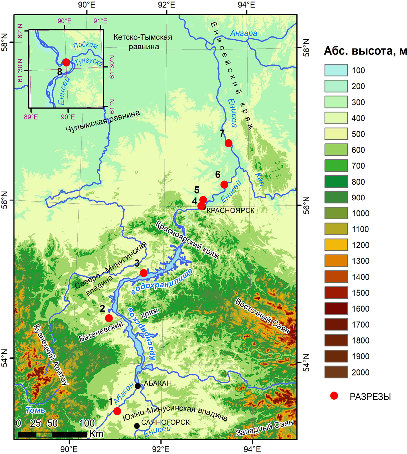 Fig. 1. Study area. 1 – quarry in the South Minusinsk Depression; 2 – well-21; 3 – Kurtak; 4 – coastal cliff near the Krasnoyarsk city hospital; 5 – quarry in the low terrace near the Korkino Village; 6 – coastal section near the Barabanovo Village; 7 – coastal section near the Beregovaya Taskino Village; 8 – well near the Bor Village.