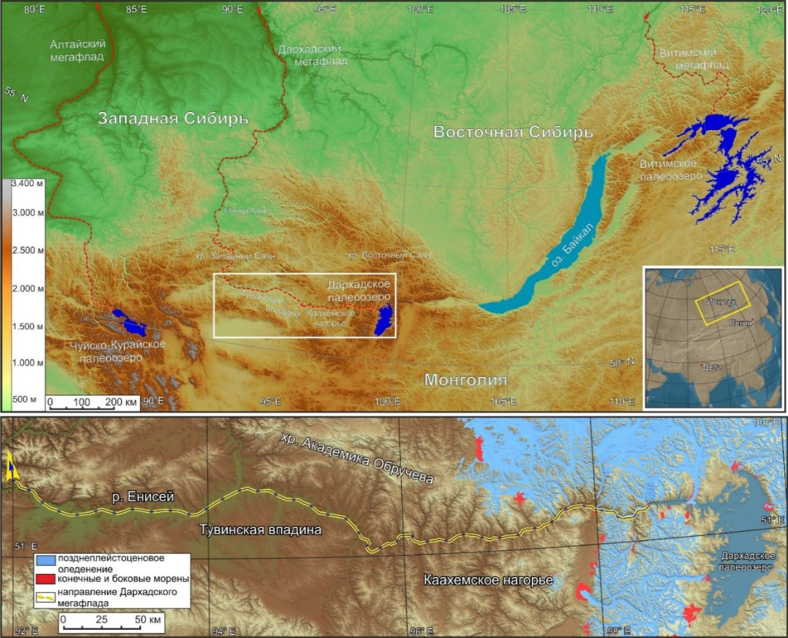 Таким образом, можно говорить о новом видении формирования Дархадского палеоозера и Дархадских суперпаводков, где основную подпорную роль выполняла крупная ледниковая дамба, расположенная гораздо ниже Тенгисийнгольского ледника. Ее деградация приводила к формированию суперпаводков, по меньшей мере, дважды, в МИС 3 и МИС 2. Влияние суперпаводков отразилось в формировании нового эрозионно-аккумулятивного рельефа (каньоны, висячие долины, гигантская рябь течения, песчаные массивы) в долине р. Енисей и на прилегающих территориях.