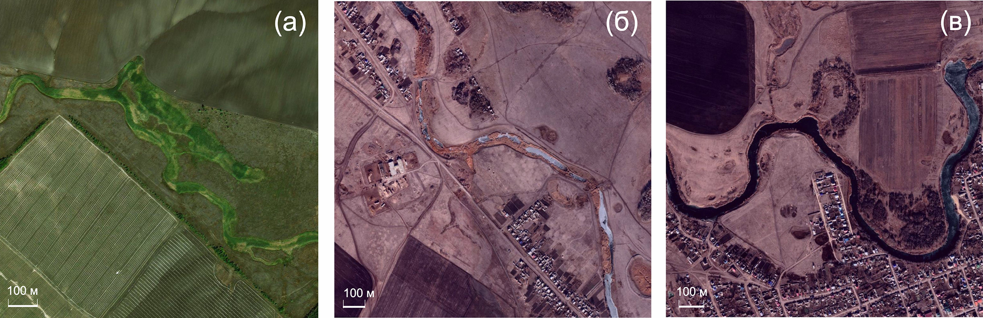 Дополнительно русла были разделены по степени зарастания. На основе анализа космических снимков на период межени выделены 3 категории: полностью заросшее (рис. 2, (a)), частично заросшее русло (рис. 2, (б)) и открытое русло (рис. 2, (в)).