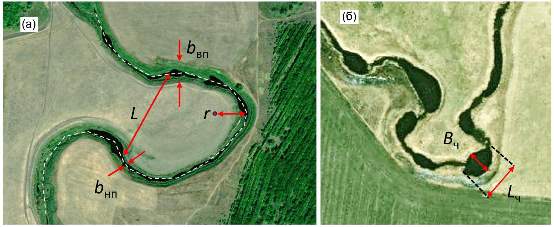 Шаг излучин (L) р. Кардаил определялся как расстояние между точками изменения знака кривизны осевой линии русла (рис. 3, (a)). Минимальные значения радиусов кривизны в пределах каждой излучины были получены при помощи специально написанной программы в Python в ArcMap 10.8 на основе обработки средней линии русла. Ширина русла р. Кардаил определялась в створах изменения кривизны осевой линии русла в верхних и нижних крыльях излучин. Определялась ширина русла в бровках высокой поймы (bвп), и ширина русла в пределах низкой поймы (bнп). Помимо этого, для чётковидных русел дополнительно определялись максимальная длина (Lч) и максимальная ширина (Bч) чёток (рис. 3, (б)).