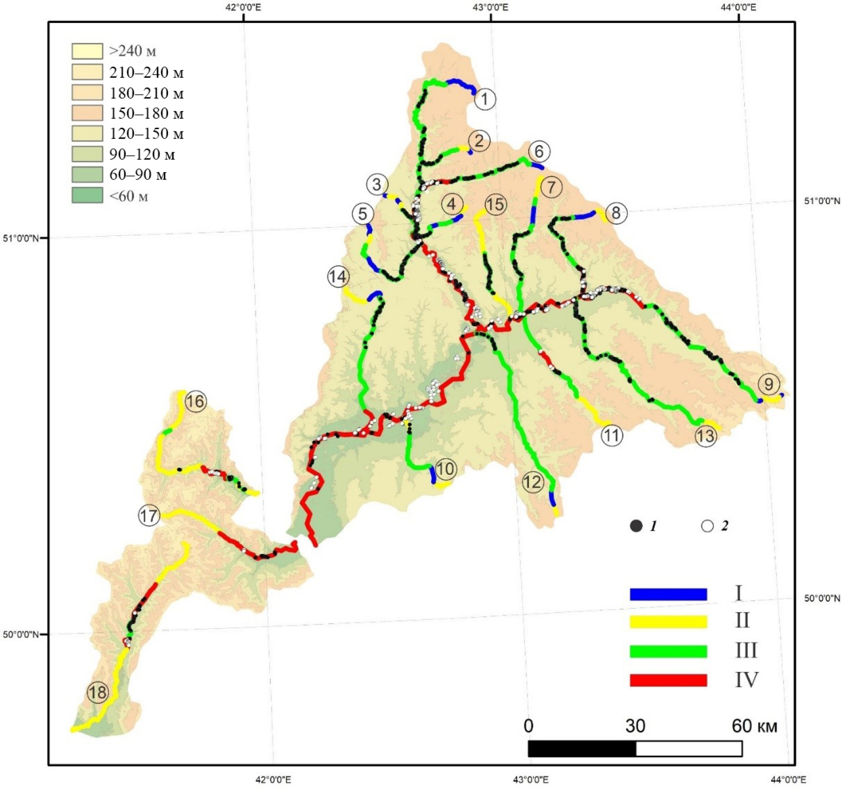 1 – beads in the main channel; 2 – beads in the oxbows. I – channel ponds (cascades of ponds); II – areas with a predominance of a relatively straight unbranched channel; III – areas with a predominance of a meandering channel; IV – areas with the presence of oxbows and secondary branches, both in functioning and silting conditions (anabranching channels). The river numbers are given in accordance with Table 1.