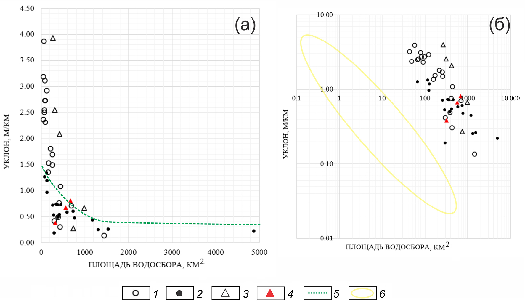 Fig. 6. Diagrams of the distribution of channels with and without beads at different catchment areas and channel gradients: (a) – in a linear coordinate system with a drawn envelope; (б) – in a logarithmic coordinate system for comparison with the rivers of the cryolithozone.